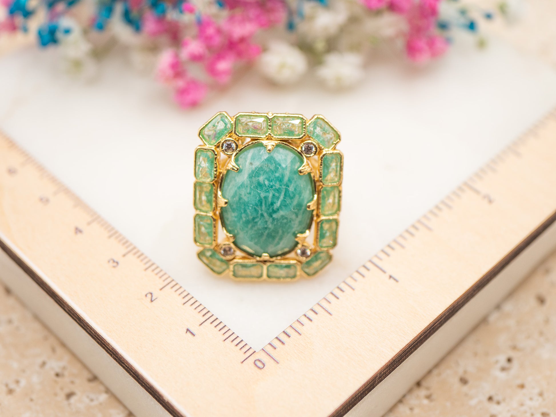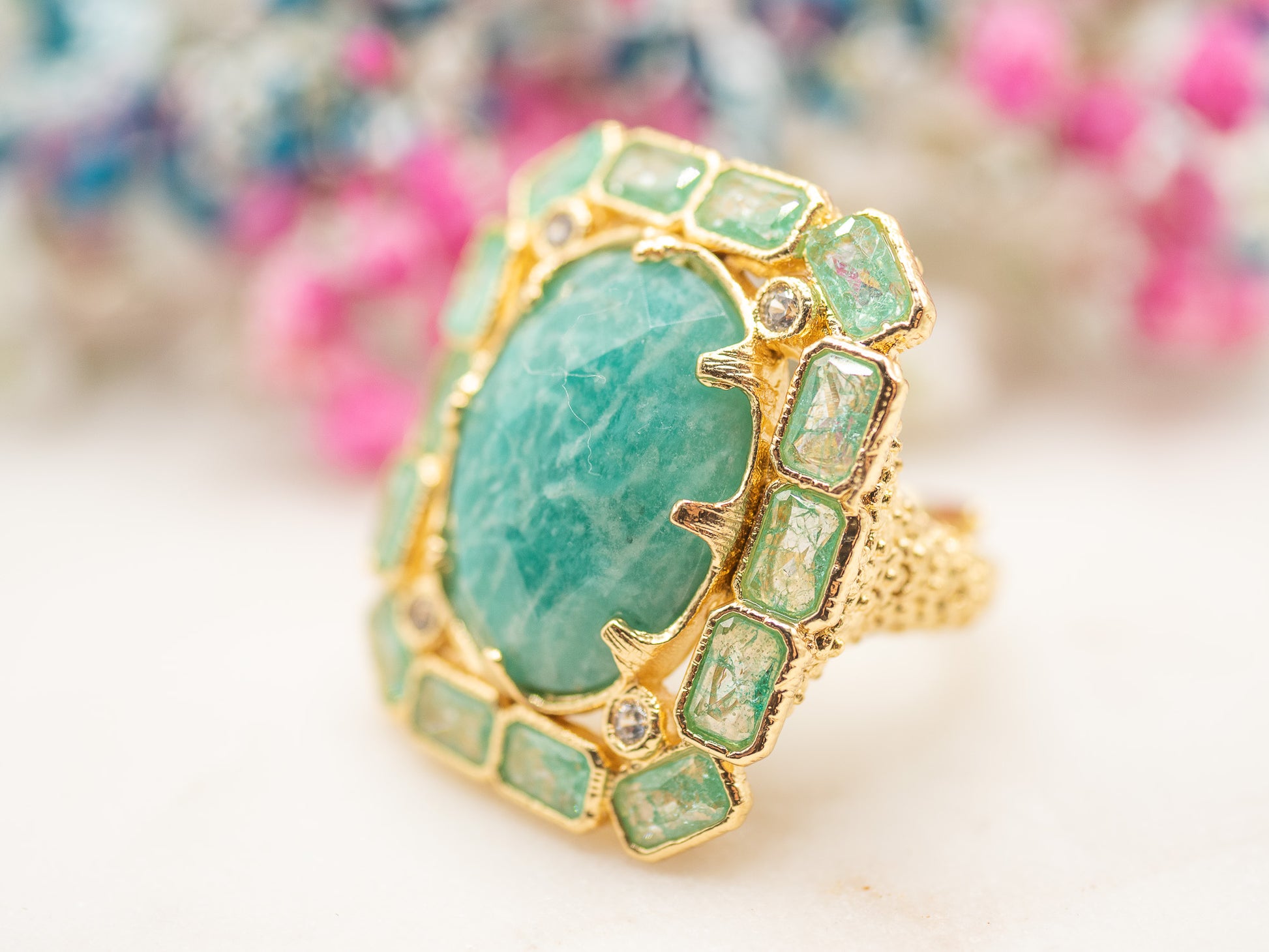 Au centre, une large amazonite ovale vert émeraude capte la lumière avec intensité. Son aspect naturellement marbré lui confère un charme organique, presque minéral, rappelant les pierres anciennes des palais mauresques. Elle est sublimée par un encadrement géométrique de cristaux rectangulaires vert clair, ponctué de petits éclats scintillants, dans une composition structurée et raffinée.