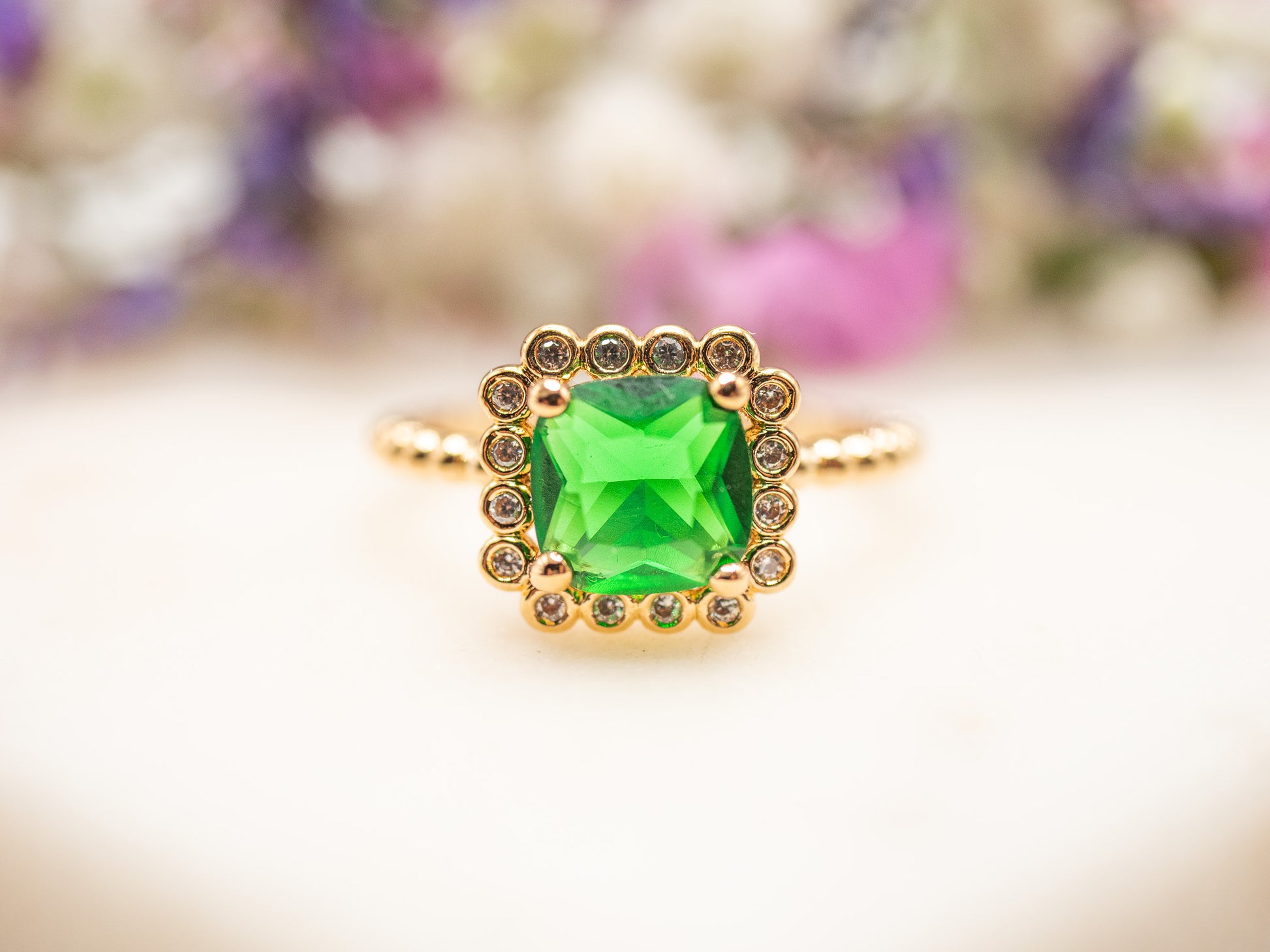 Carnaby, c’est l’audace des sixties qui flirte avec le glamour des seventies. Cette bague en plaqué or 18 carats affiche une présence irrésistible avec son design sculptural et son vert éclatant, digne des vitrines de King’s Road. Au centre, un cristal vert taille coussin de 7 mm x 7 mm, évoquant une péridot lumineuse, est entourée de 12 petits zirconiums ronds d’environ 1,5 mm de diamètre imitant l’éclat du diamant champagne.