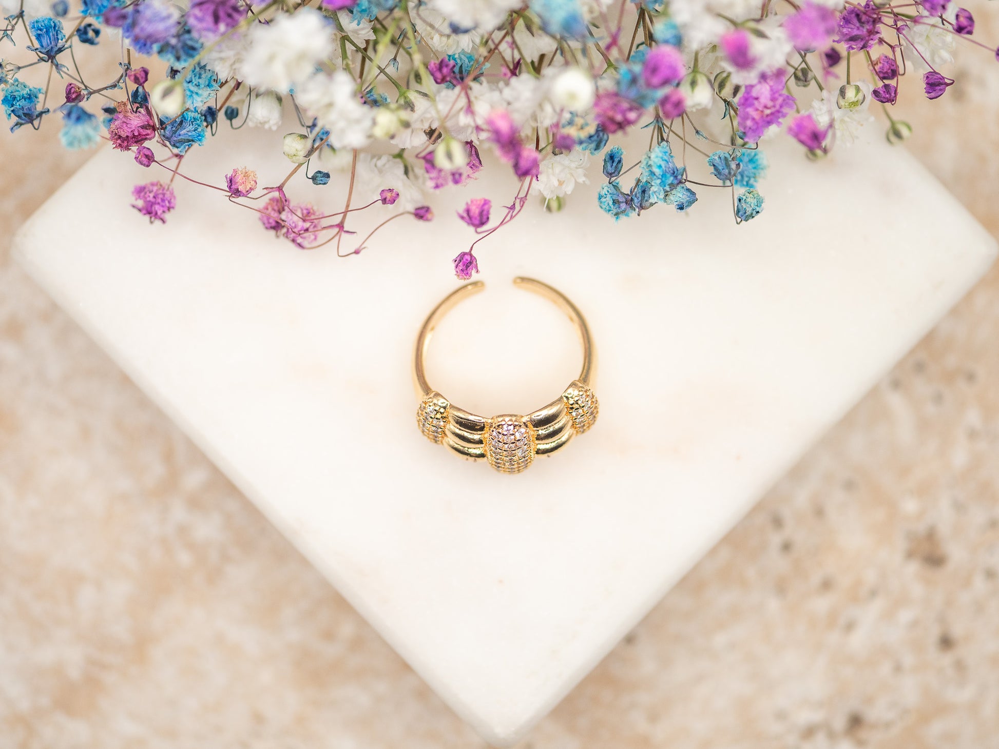 Composée de cinq anneaux dorés fusionnés dans un design bombé et fluide, elle est surmontée de trois plaques elliptiques pavées de zirconiums ronds scintillants, placées en alternance. Le tout est monté sur une structure en plaqué or, solide, brillante et résistante à l’eau.
