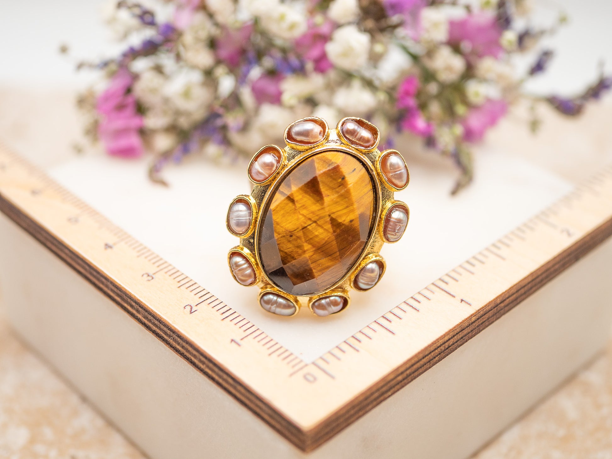 Icône de caractère et de raffinement, la bague Hazel capture l’essence des seventies londoniennes avec une intensité solaire. Son cabochon central en œil de tigre, aux reflets dorés et bruns hypnotiques, est sublimé par un entourage de perles nacrées qui rappellent l’élégance sophistiquée d’une époque marquée par l’audace et la féminité.