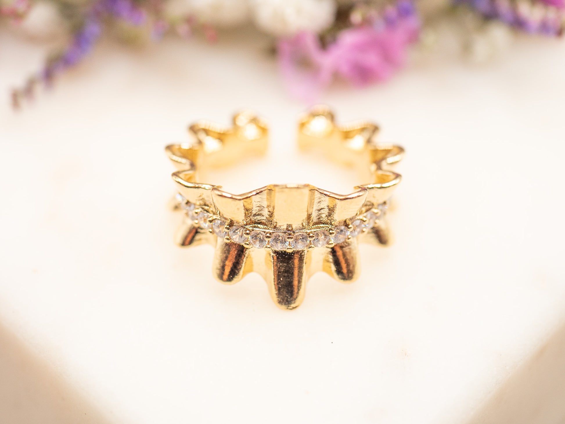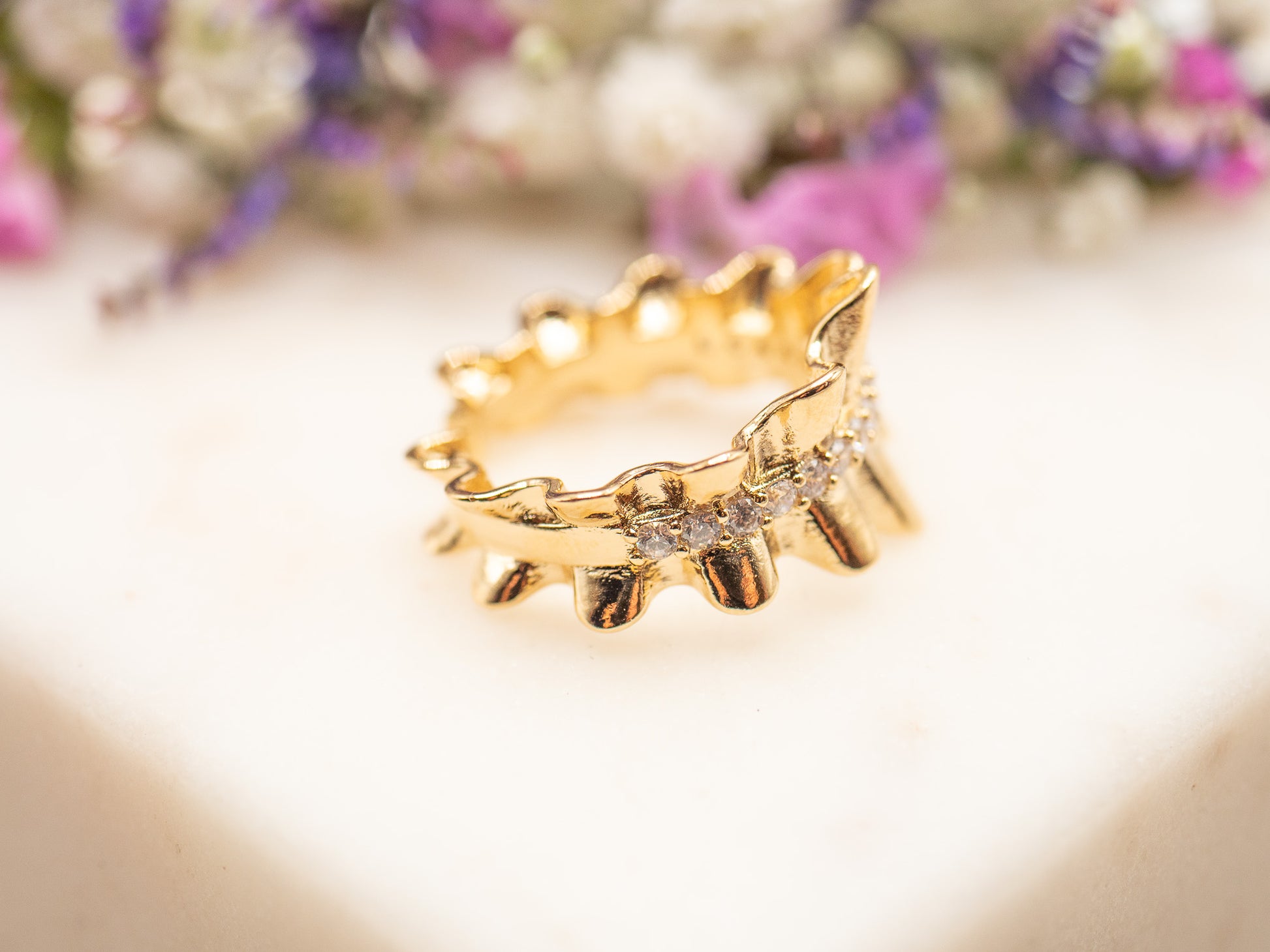 Temple, c’est la bague des reines modernes, celles qui gouvernent leur style avec panache — entre théâtre baroque et esprit punk chic. En plaqué or 18 carats, sa structure ondulée et irrégulière évoque une dentelle métallique ou une couronne déconstruite, comme façonnée à la main dans un atelier de créateur à Notting Hill.
