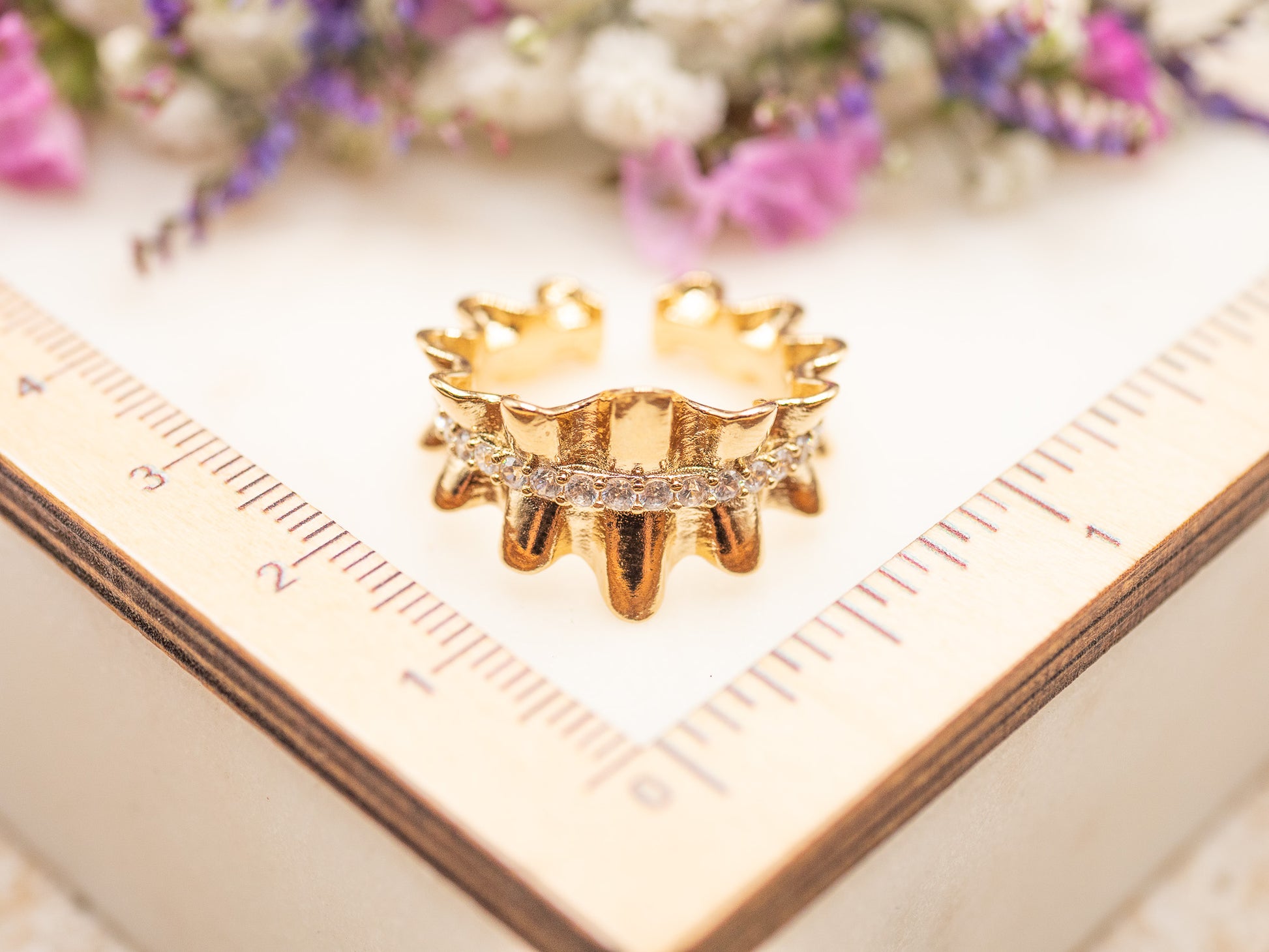En son centre, une ligne de zircons blancs facettés d’environ 1 mm apporte une touche d’éclat raffinée, en contraste avec le relief brut du métal doré. Cette pièce semble sortie d’un défilé expérimental ou d’un rêve de styliste inspiré par l’architecture gothique et la lumière d’un matin pluvieux sur Londres.