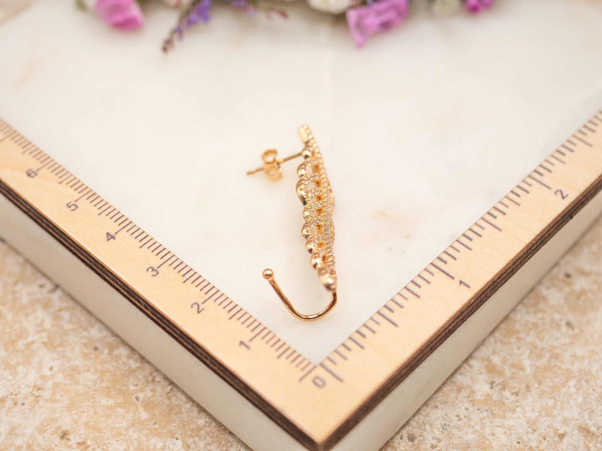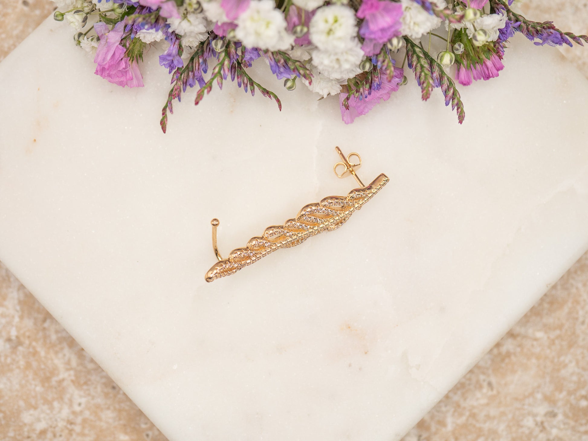 Drama, c’est la boucle qui grimpe le long de l’oreille comme un secret bien gardé — un éclat théâtral, baroque et un brin rebelle. En plaqué or 18 carats, sa courbe délicatement ascendante épouse l’oreille avec élégance, tandis que ses zirconiums facettés captent la lumière comme les projecteurs d’un théâtre de Soho.