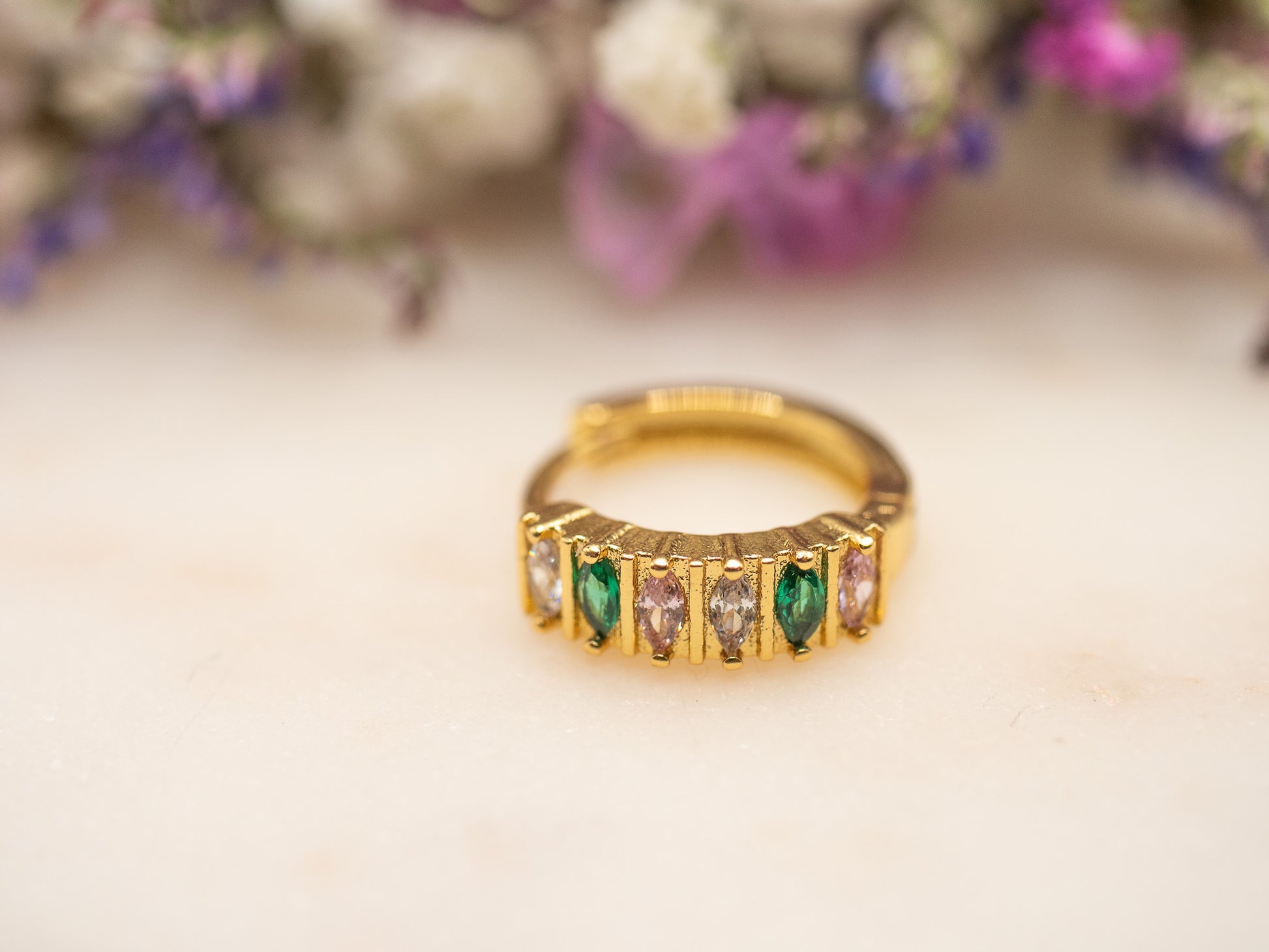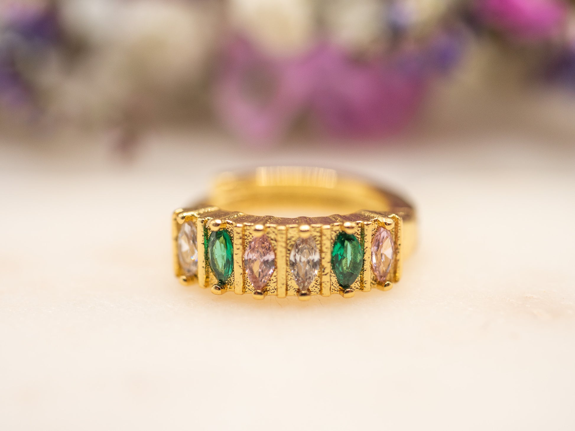 Colorées, audacieuses et raffinées — la créole Evelyn incarne l’énergie vibrante du Swinging London. Son anneau doré en plaqué or 18 carats s’illumine de cristaux serties en taille marquise et ronde : vert profond rappelant l’émeraude, violet doux inspiré de l’améthyste, et éclats cristallins proches du quartz clair. Un bouquet minéral qui joue avec la lumière comme les vitrines flamboyantes de Carnaby Street dans les années 70.