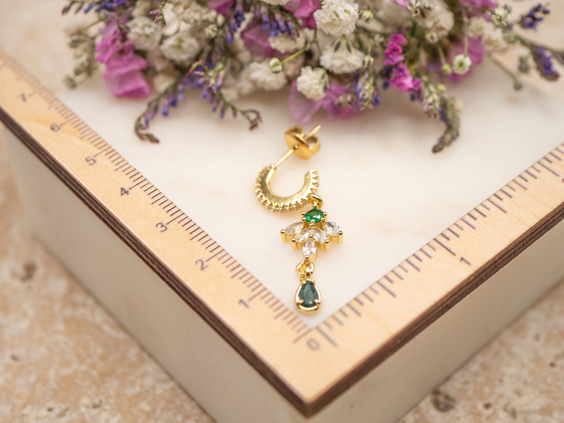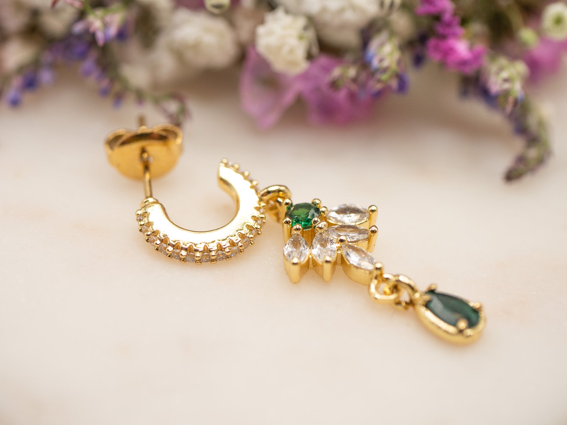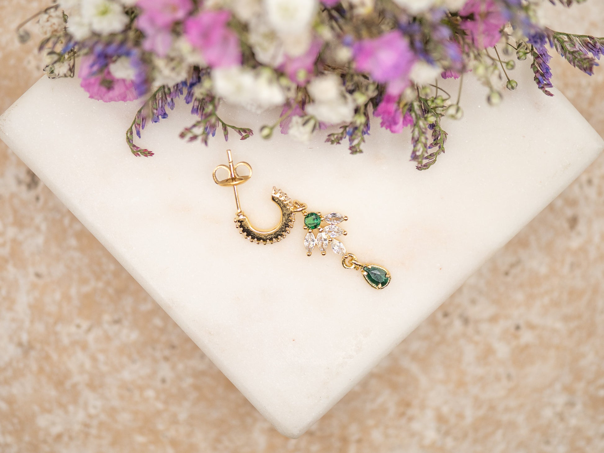 Chaleureuse, raffinée et singulière — la boucle Saffron incarne l’audace colorée des années 70. Son anneau en acier inoxydable, serti de cristaux lumineux, dévoile un pendentif en forme de goutte, orné d’une pierre semi-précieuse vert intense qui rappelle l’éclat mystérieux de l’émeraude.