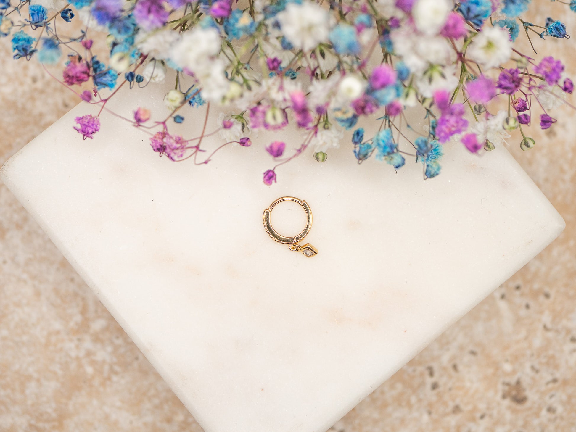Discrète et élégante, Amberleigh Charm est une boucle d’oreille unique en plaqué or 18 carats inspirée d’un bijou ancien retrouvé dans une boîte à musique dans un cottage du Yorkshire. Son petit pendentif rectangulaire scintille comme une lumière de lanterne à travers les vitres givrées d’un soir d’hiver.