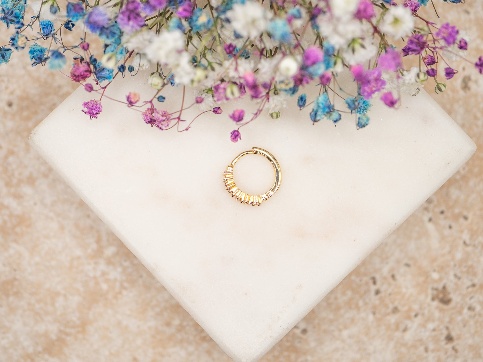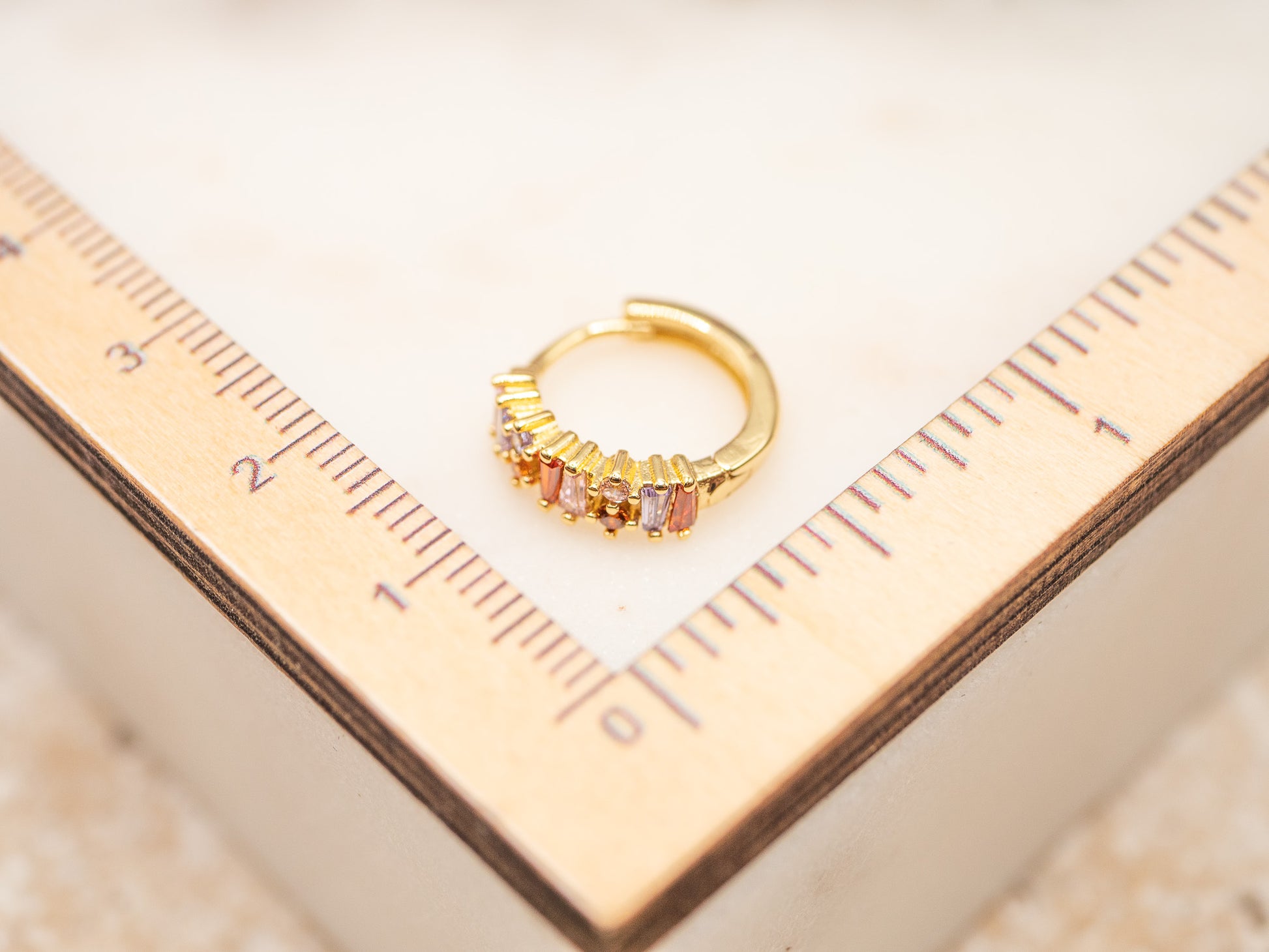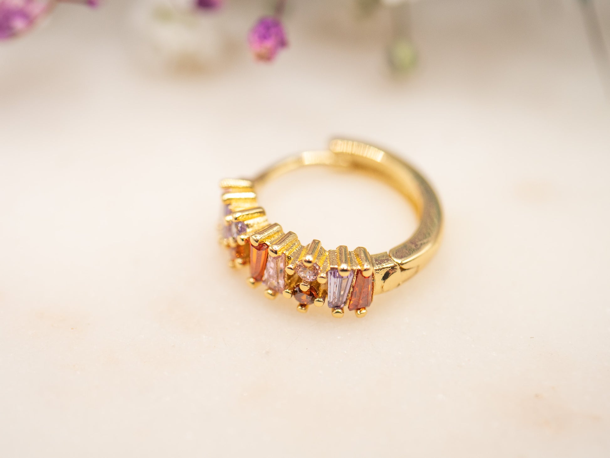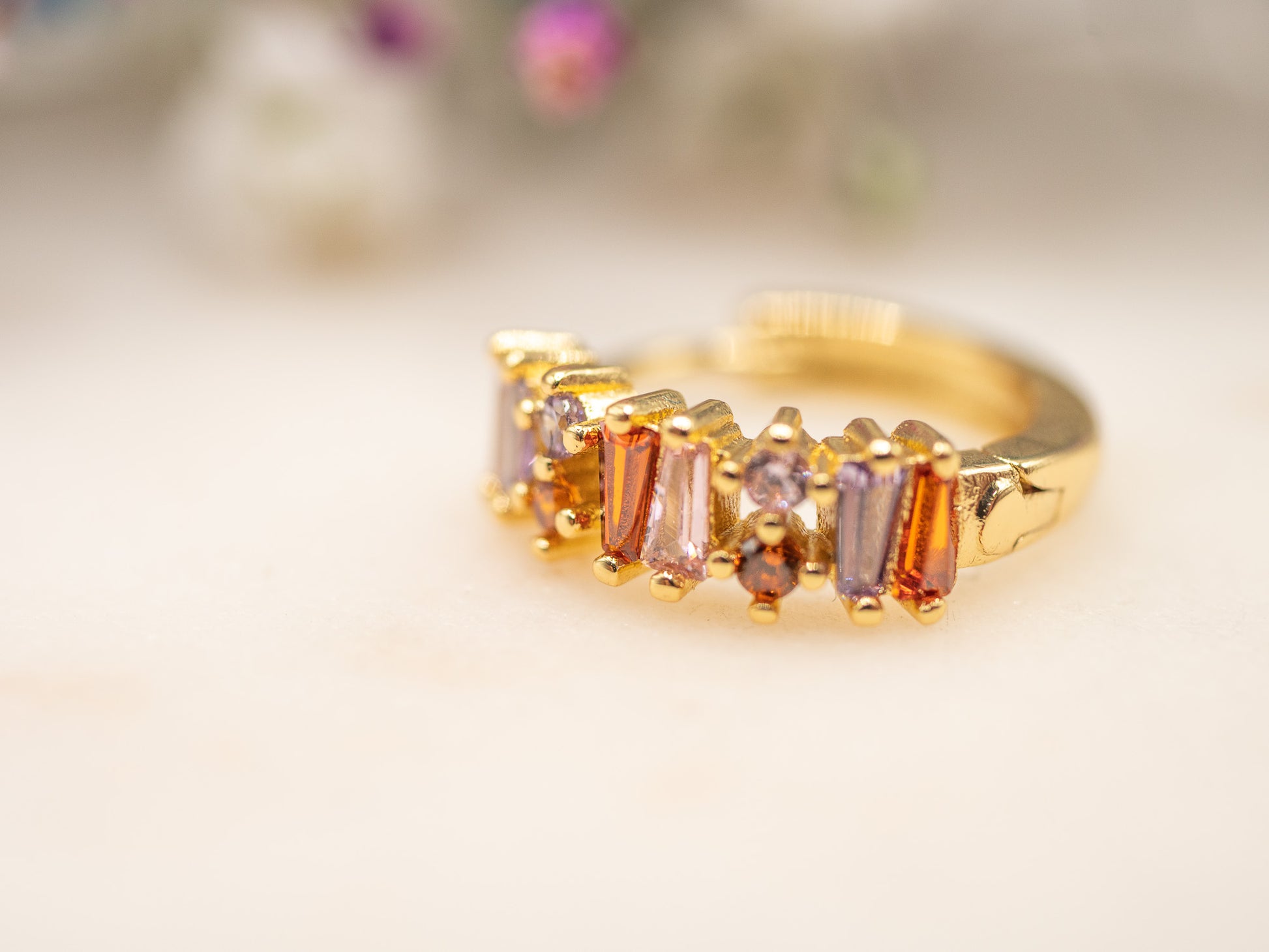 Cette boucle d’oreille unique mêle l’éclat de l’or à une rangée de cristaux baguette aux tons pastels et gourmands : rose, lavande, pêche et lilas.