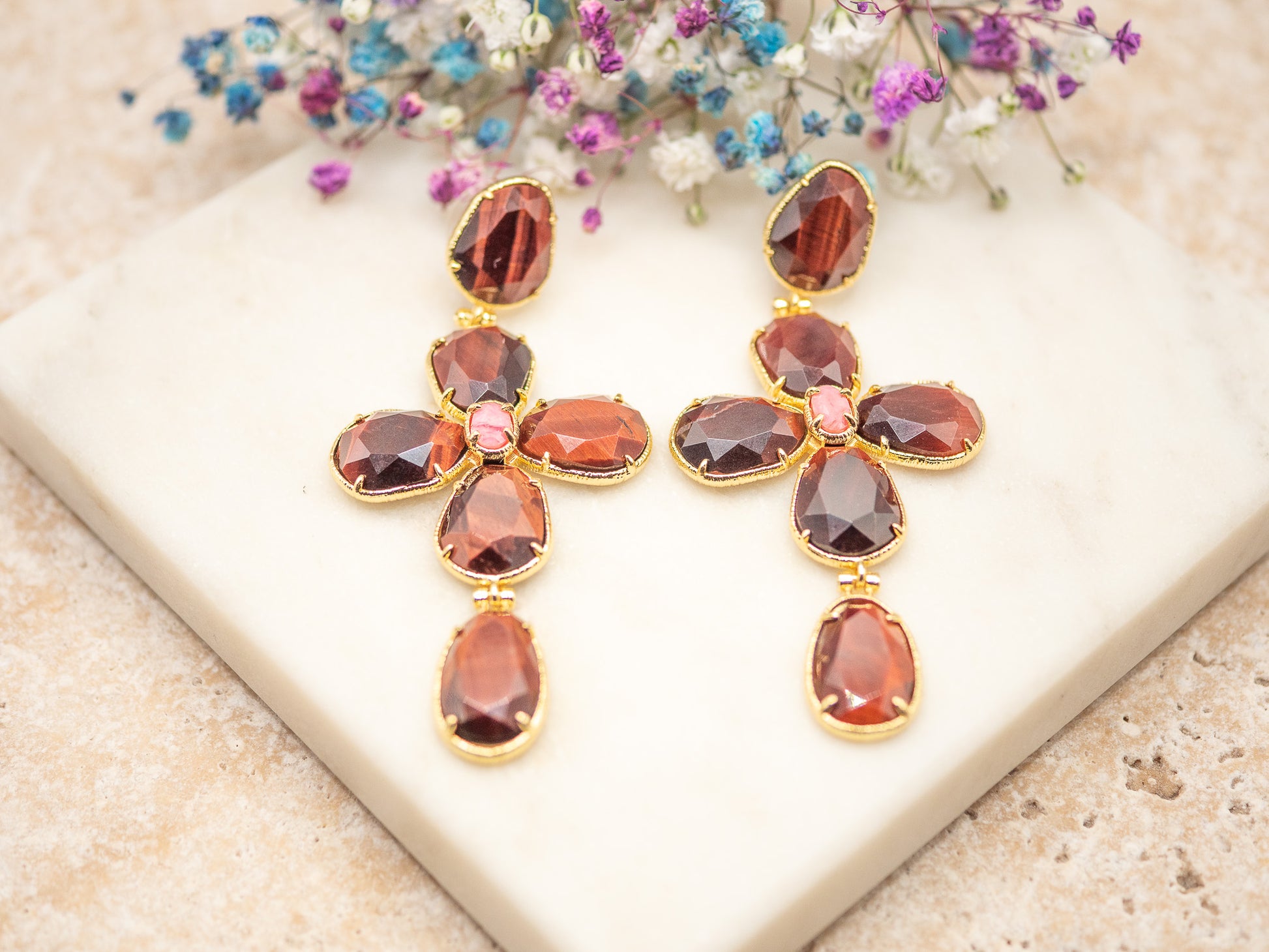 Majestueuses et baroques, Cathedral est une paire de boucles d’oreilles pendantes qui évoque les vitraux d’une vieille cathédrale anglaise éclairée à la bougie. Avec leur silhouette en forme de croix stylisée et leurs grandes améthystes facettées, elles incarnent une élégance dramatique et romantique à souhait.