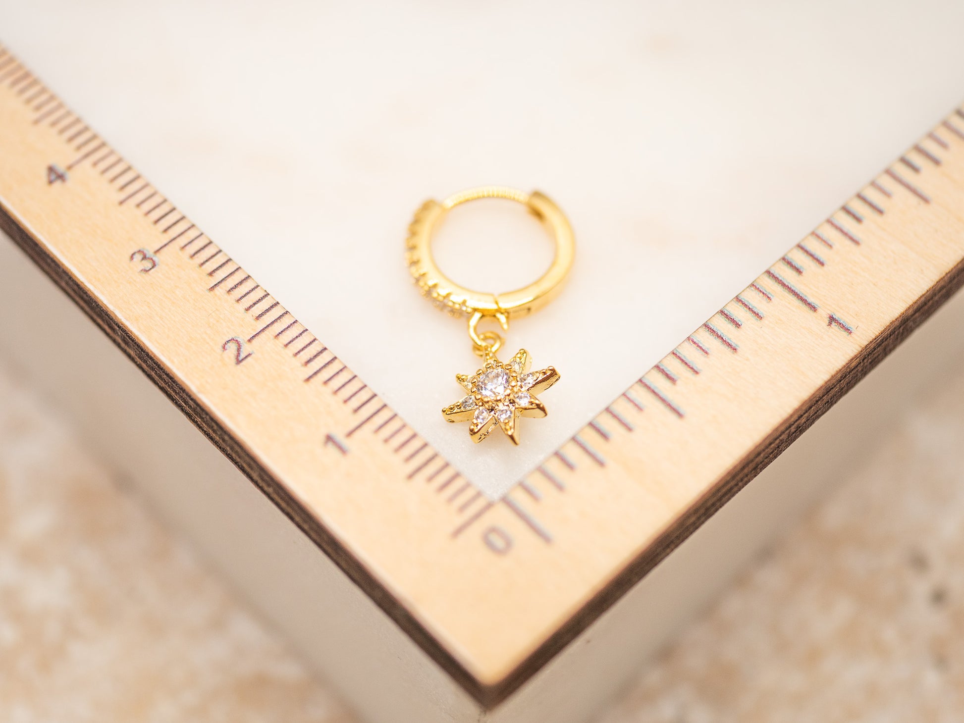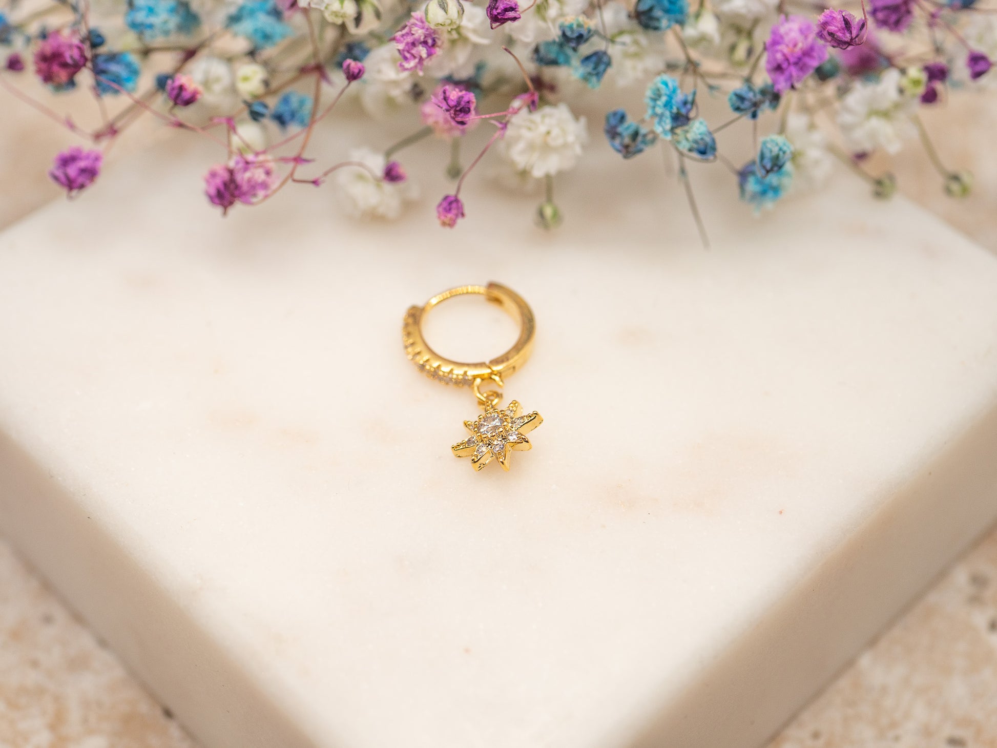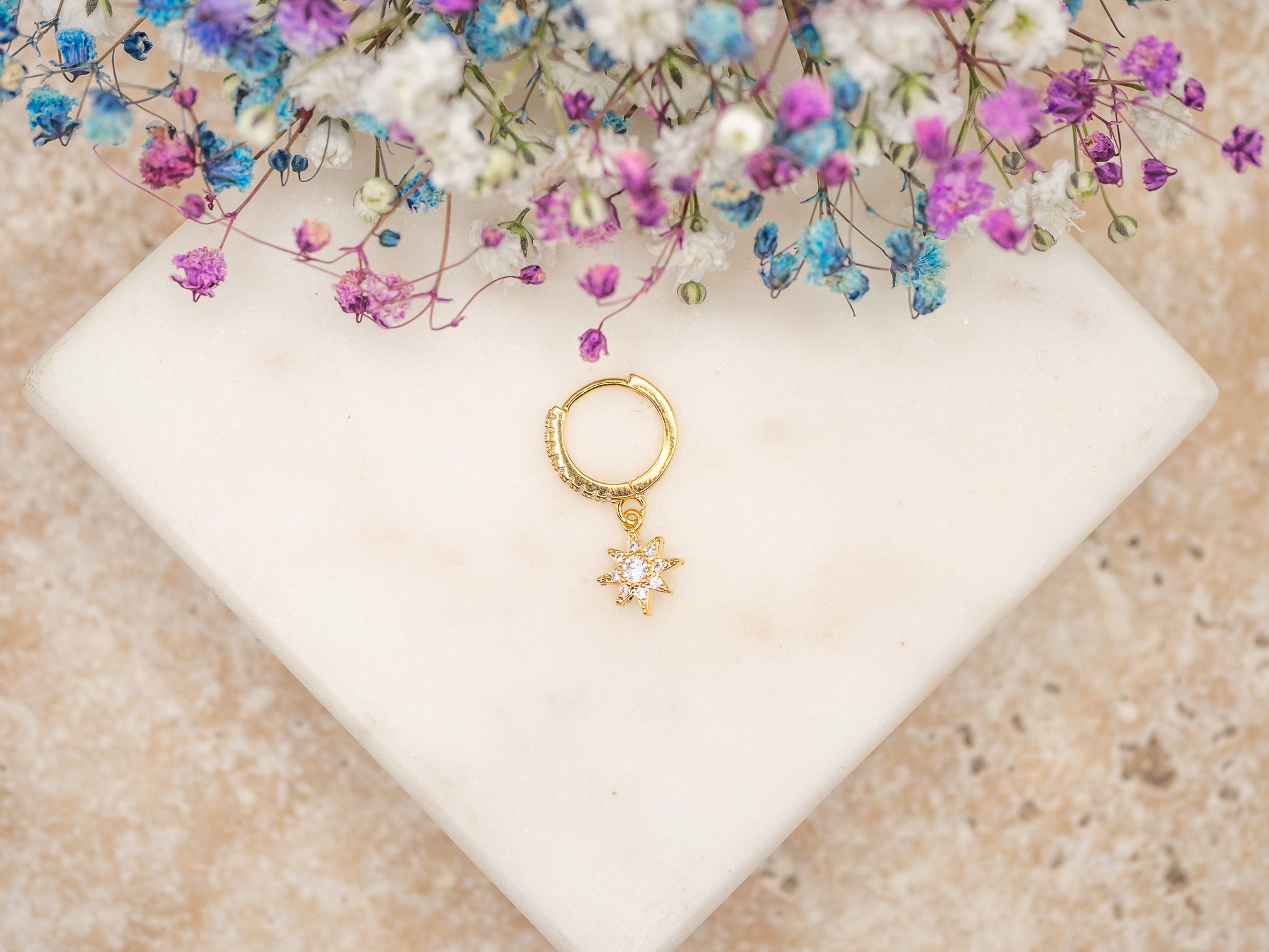 Comme une étoile filante qui traverse le ciel d’hiver, Twilight Star est une boucle d’oreille plaquée or 18 carats en forme de petite étoile à huit branches, éclatante et raffinée. Suspendue à un anneau finement texturé, cette étoile scintille grâce à un zirconium central rond et des détails lumineux, évoquant la magie des nuits de décembre.
