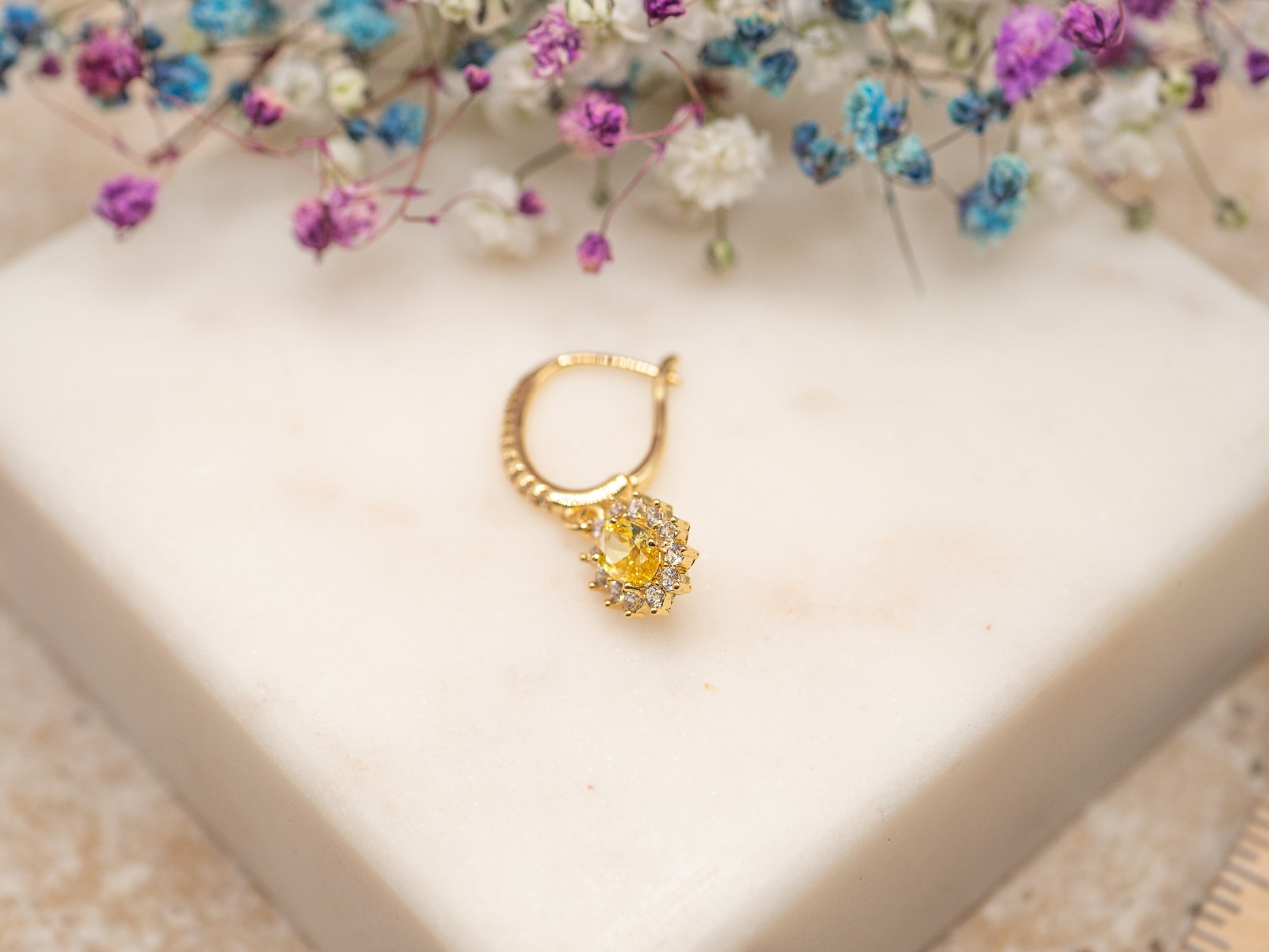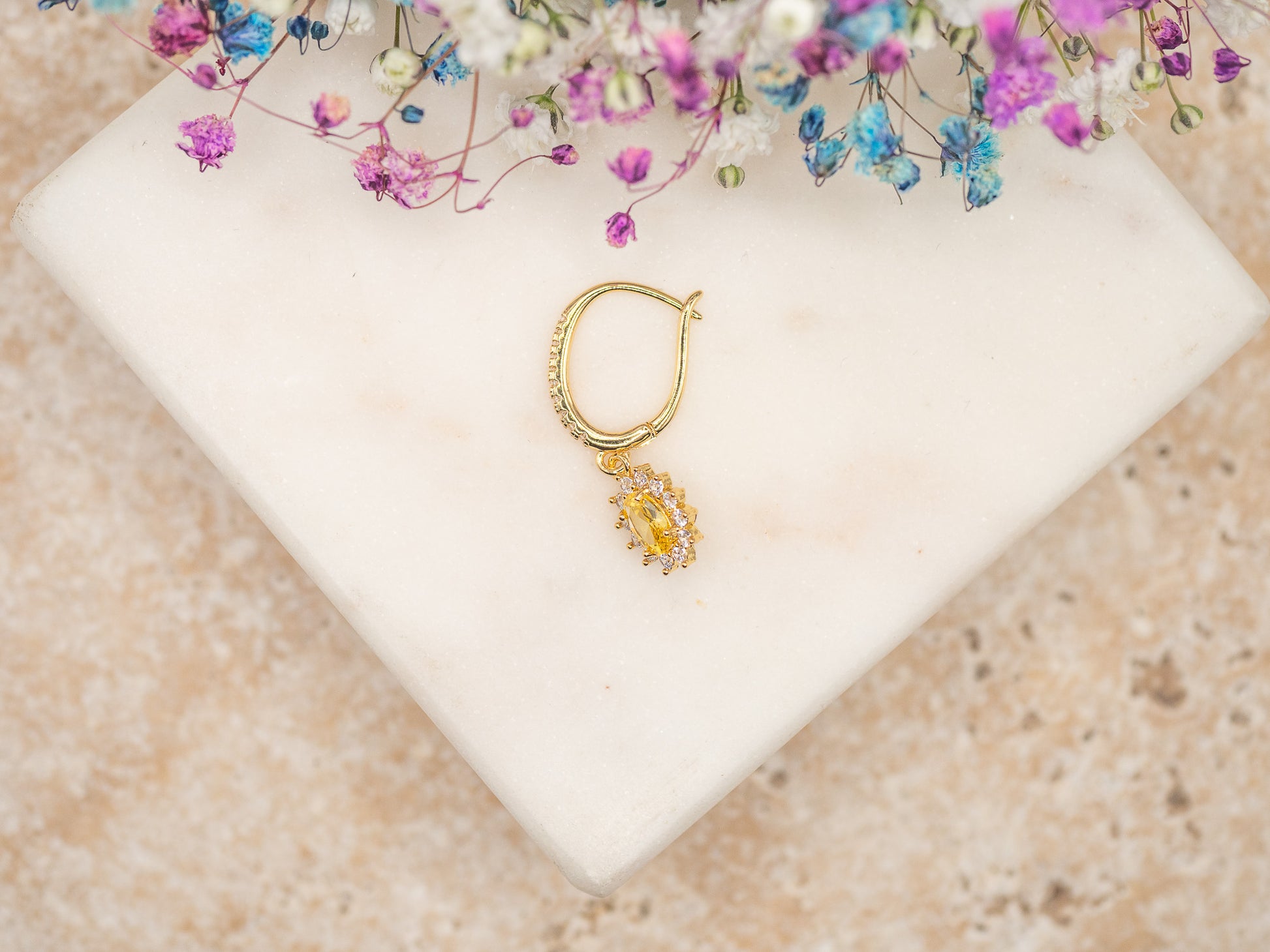 Son cœur est composé d’un cristal jaune doré facetté, délicatement entouré d’un halo de zirconiums rappelant les cristaux de givre. Montée sur un fermoir à levier doré à la texture perlée, cette boucle capte la lumière avec subtilité, comme une fleur précieuse dans un paysage givré.