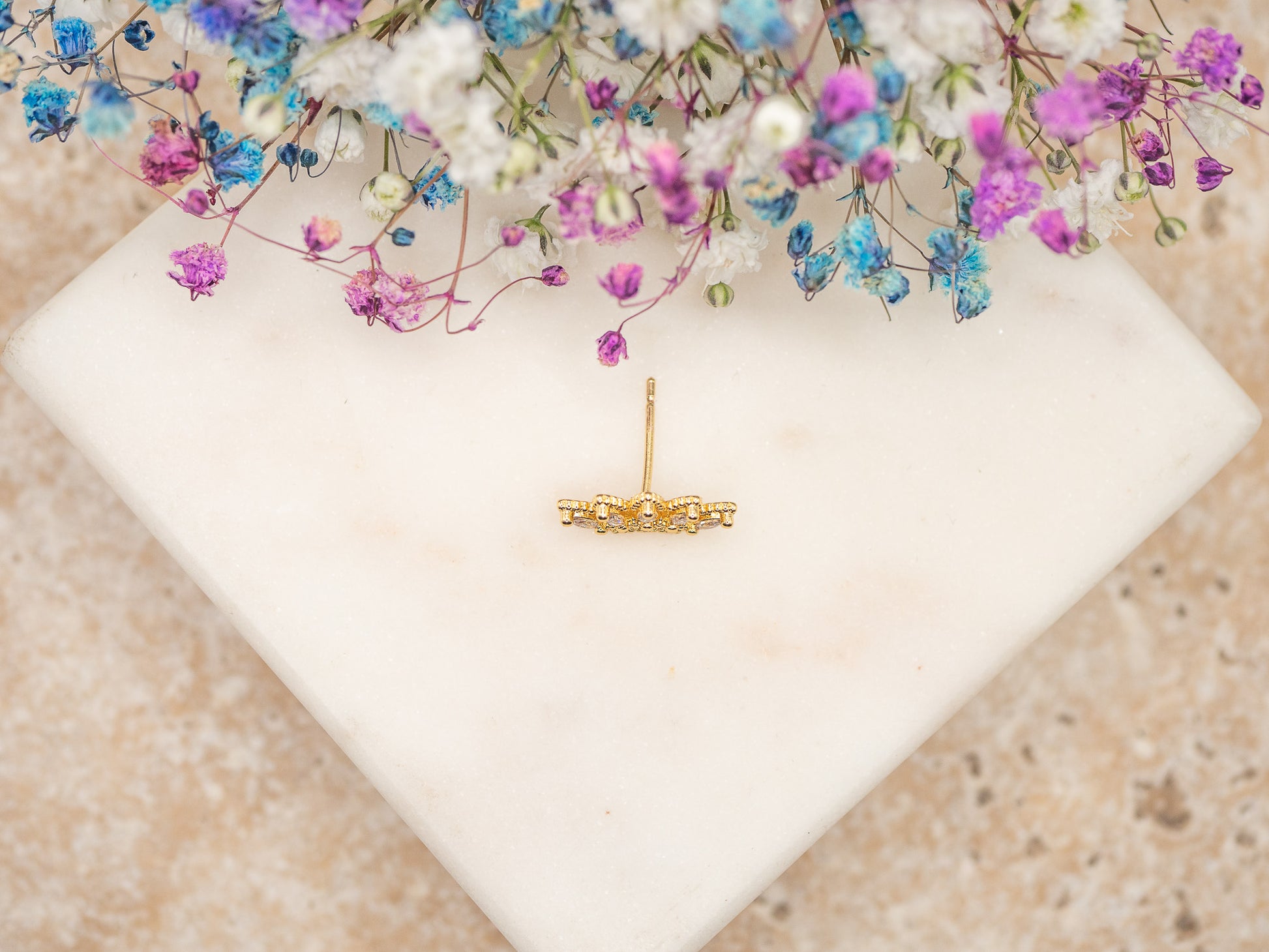 Chaque pierre est soigneusement sertie dans une monture en plaqué or 18 carats perlée, pour un rendu à la fois précieux et vintage. Le tout forme une silhouette élégante, fine et lumineuse, qui rehausse le lobe avec délicatesse.
