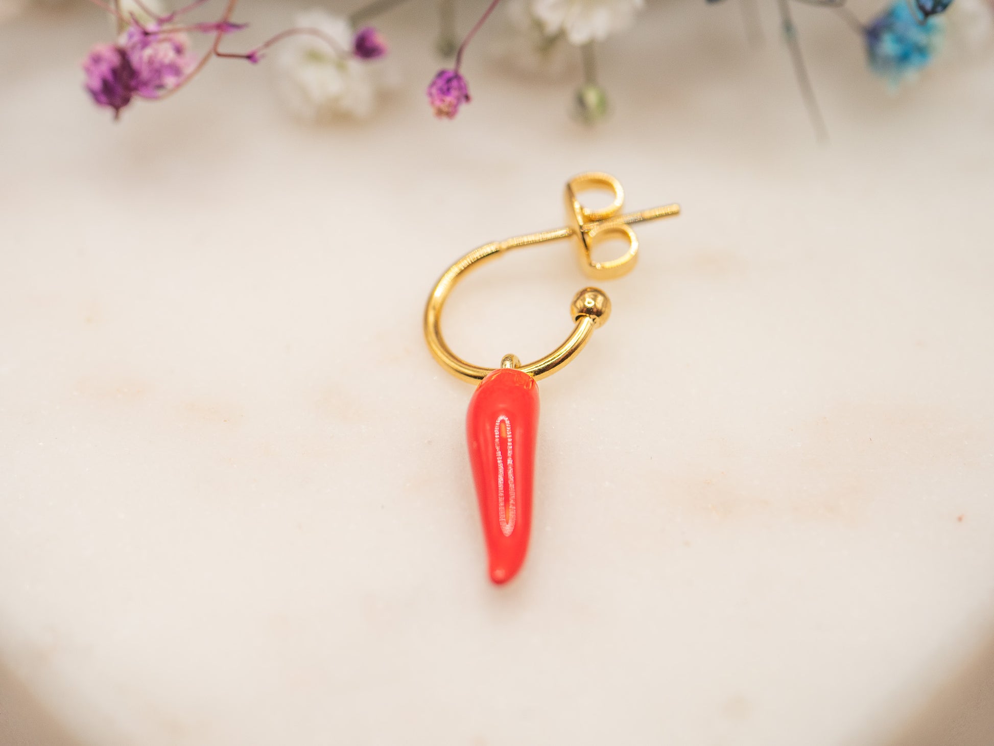 Elle se compose d’une petite créole dorée ornée d’un pendentif en forme de corne italienne rouge, symbole traditionnel de chance et de protection.