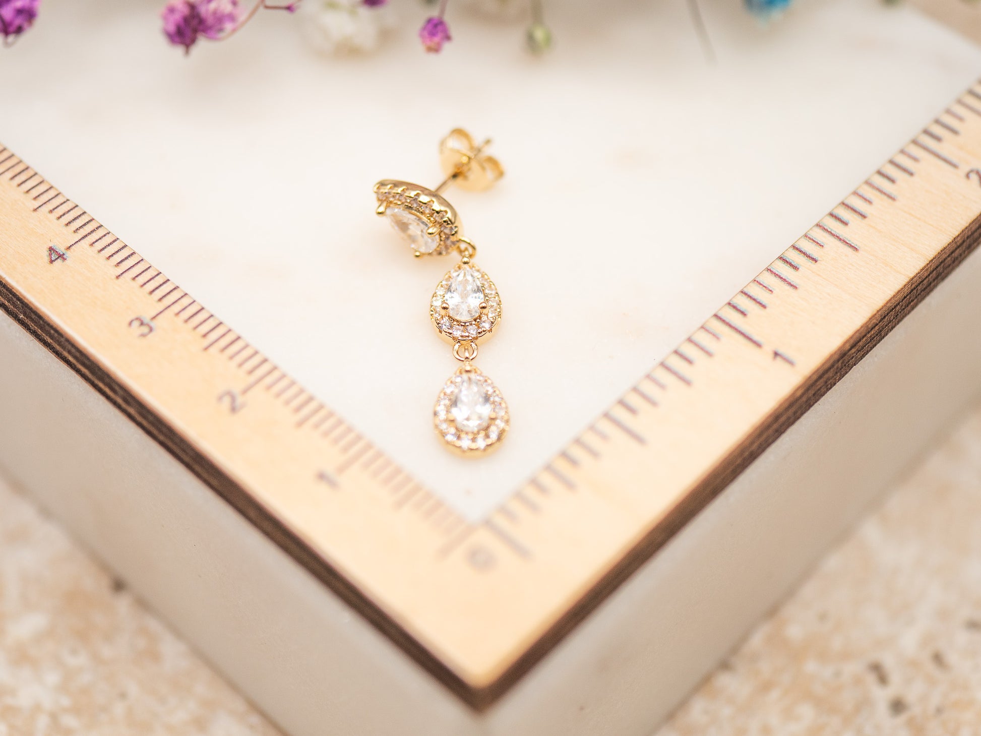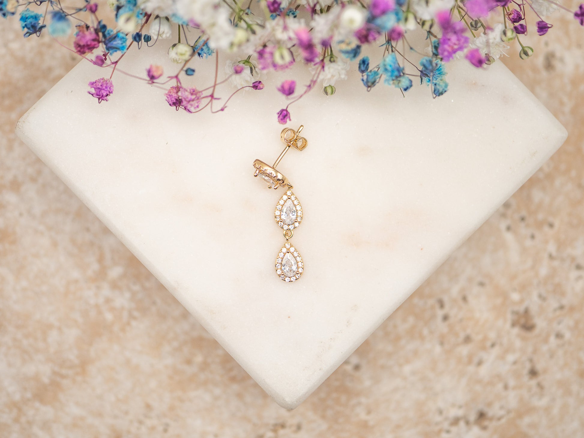 Avec ses deux gouttes en cristaux facettés suspendues à une base pavée, elle allie sophistication et éclat.