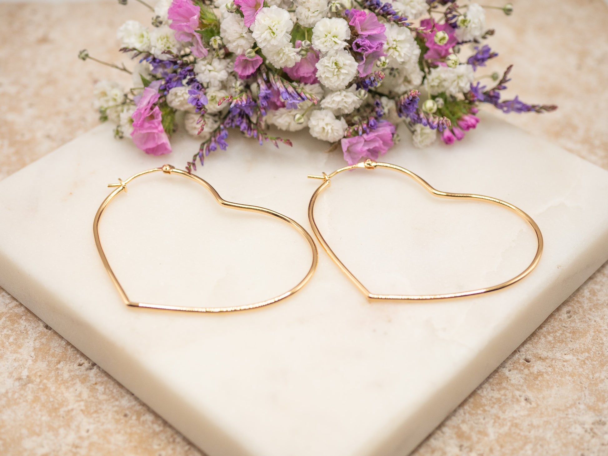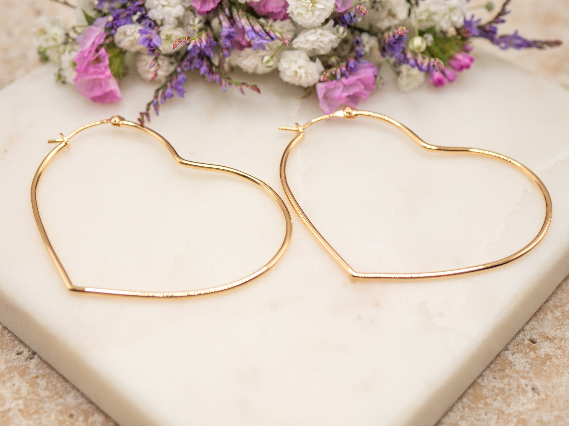 En plaqué or 18 carats, elles mesurent 6,2 cm de hauteur pour environ 5,5 cm de largeur, avec une ligne fine et souple qui dessine un cœur à la fois affirmé et minimal. Le bijou parfait pour celles qui veulent dire « je t’aime » sans le dire, ou juste flirter avec leur reflet dans la vitrine d’un pub.