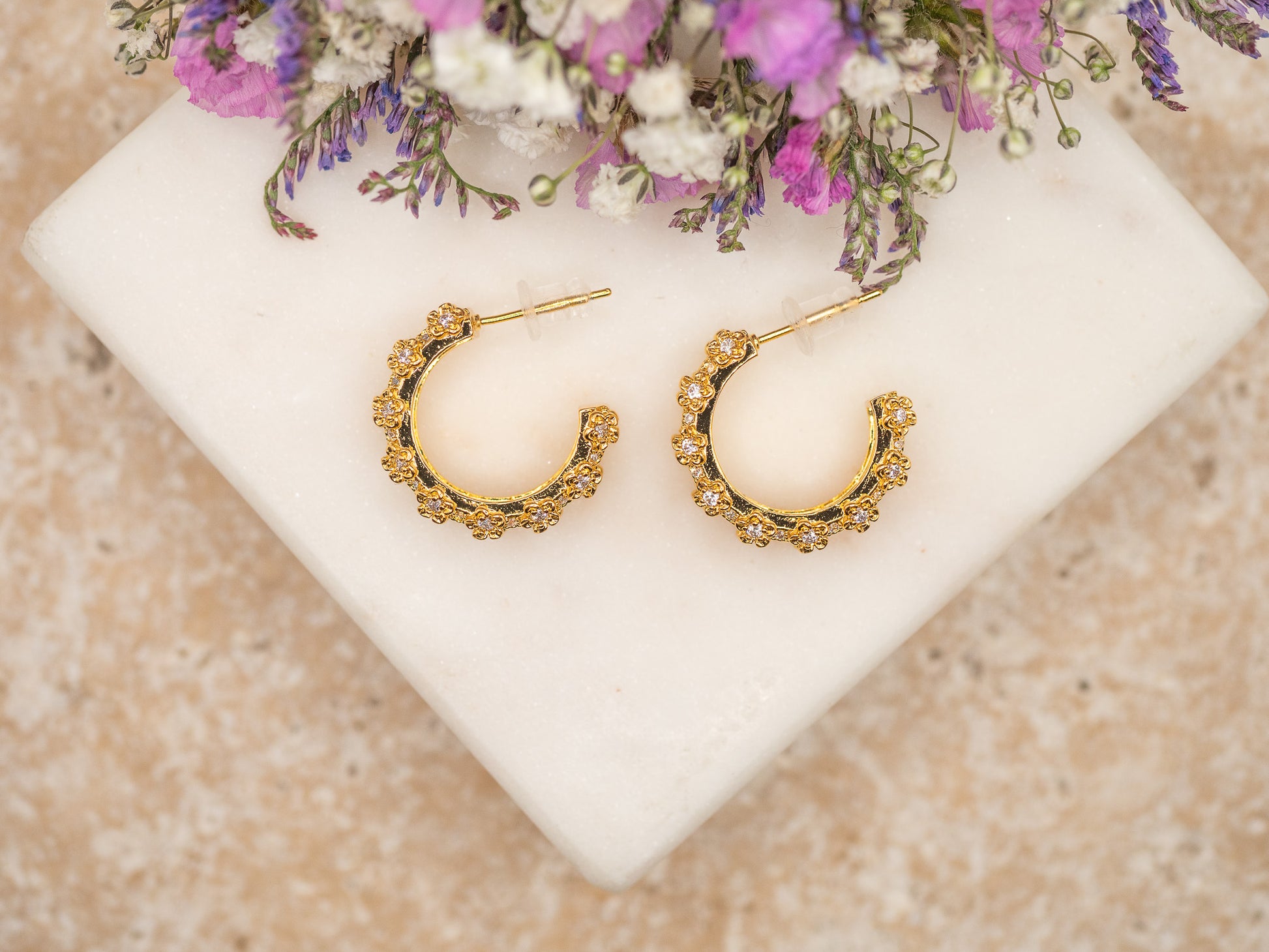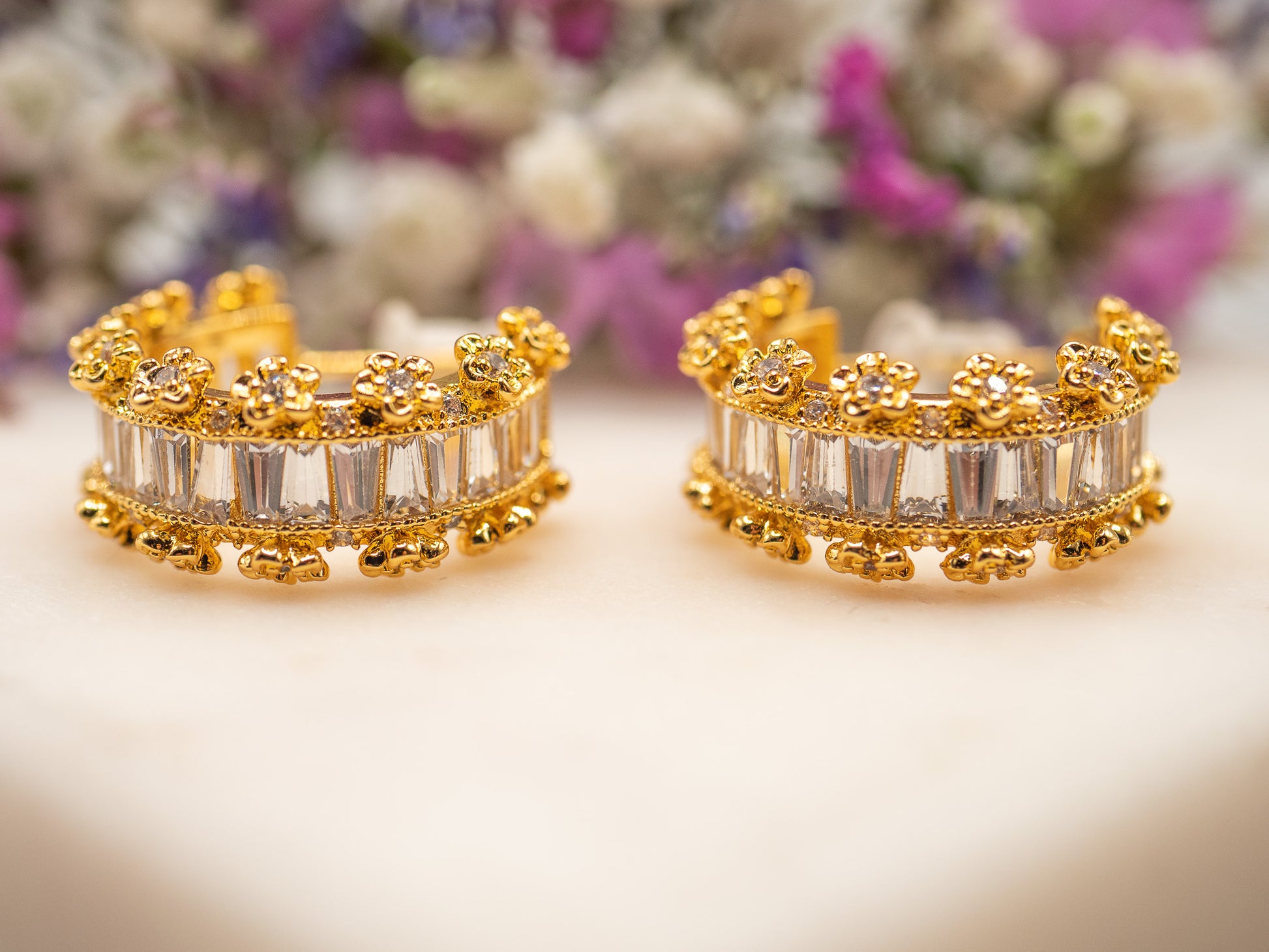Leur demi-anneau en acier inoxydable est orné d’une rangée de cristaux taillés baguette qui captent chaque rayon de lumière, sublimés par un délicat décor de petites fleurs serties de zirconiums brillants. Un bijou qui illumine le visage comme une aurore dorée, transformant chaque instant en moment d’éclat.