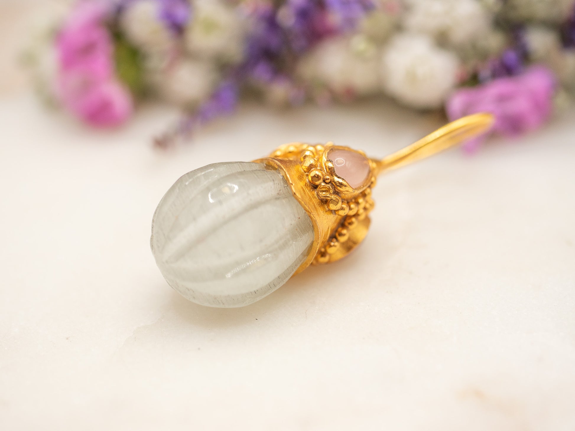 Les boucles Beattie évoquent les mystères d’un marché aux pierres semi-précieuses à Portobello Road. Montées sur crochet doré, elles arborent une calcite sculptée gris-vert translucide, encadrée d’un serti à billes en métal doré orné de petites calcites rosées. Entre artisanat ancien et esprit victorien revisité, elles insufflent une vibration ésotérique et romantique.