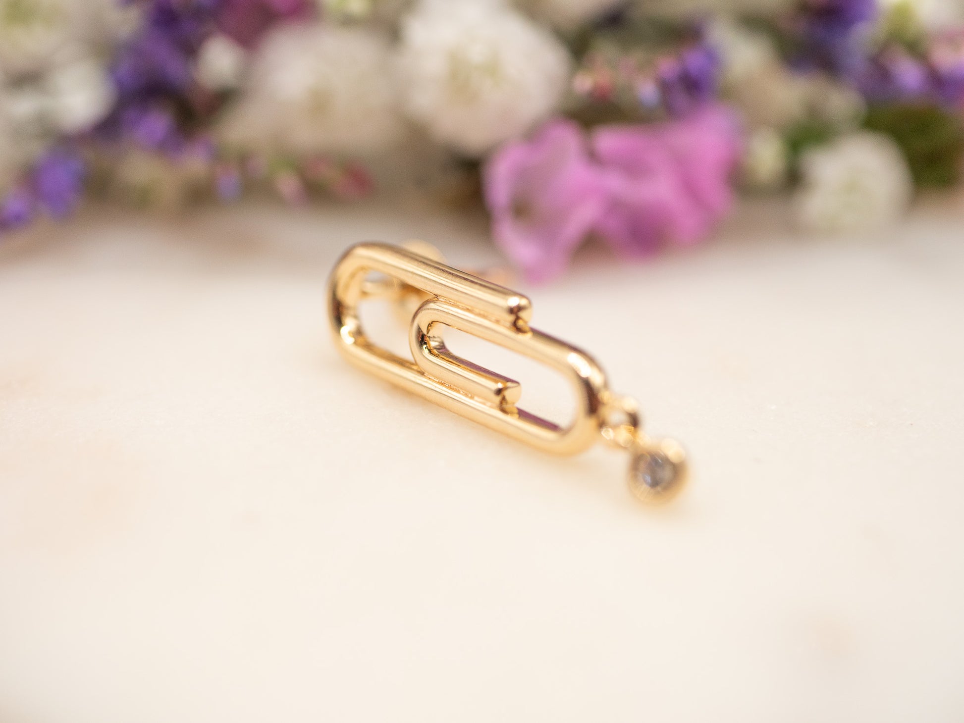 En plaqué or 18 carats, leurs structures allongées s’achèvent sur un petit zirconium blanc facetté, monté en pendentif. Une touche d’éclat subtile, comme un clin d’œil à la nuit londonienne.