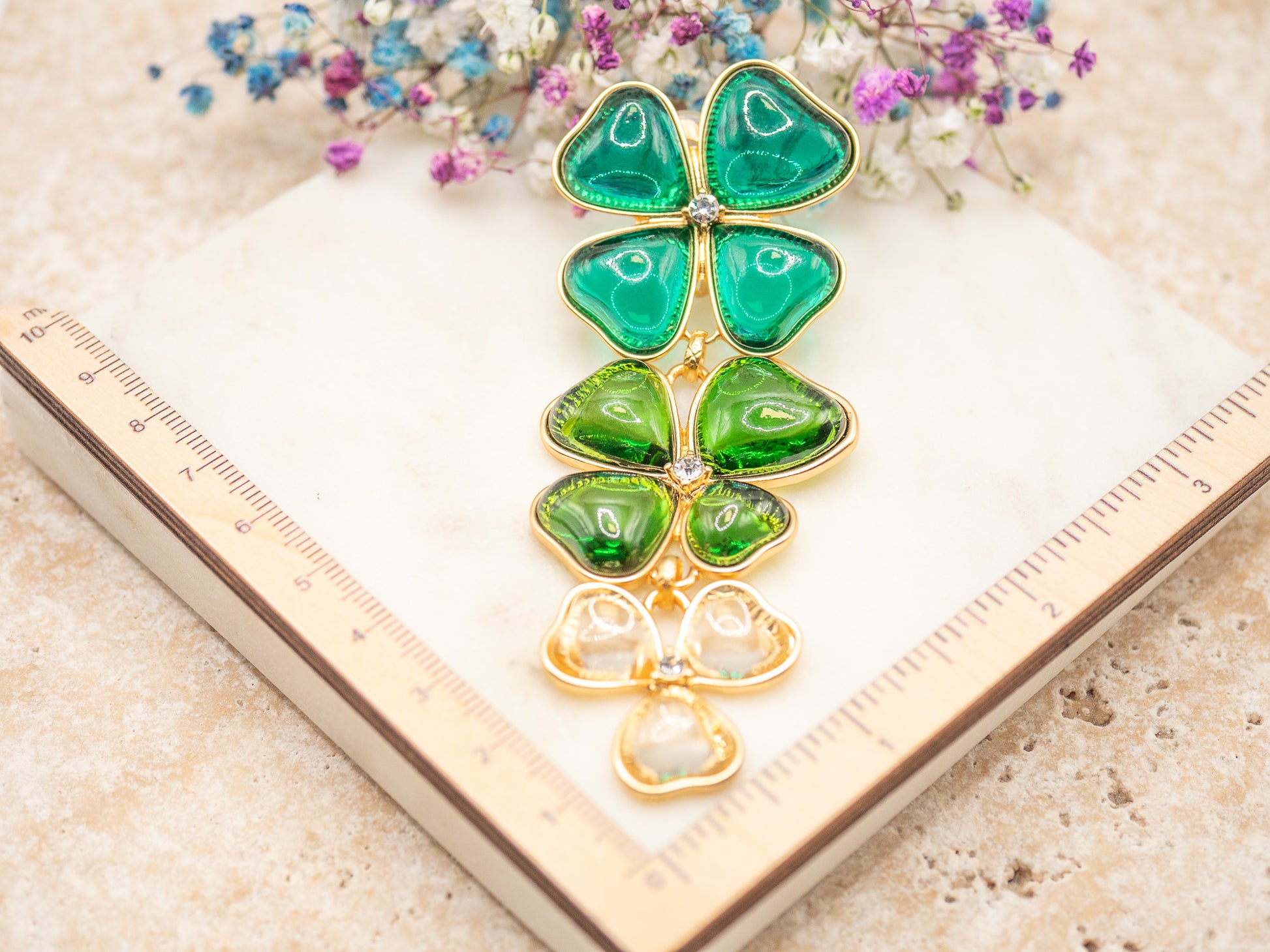 • Matériaux : Résine colorée translucide (pétales), zirconiums centraux (~0,3 cm), monture en plaqué or 18 carats.
