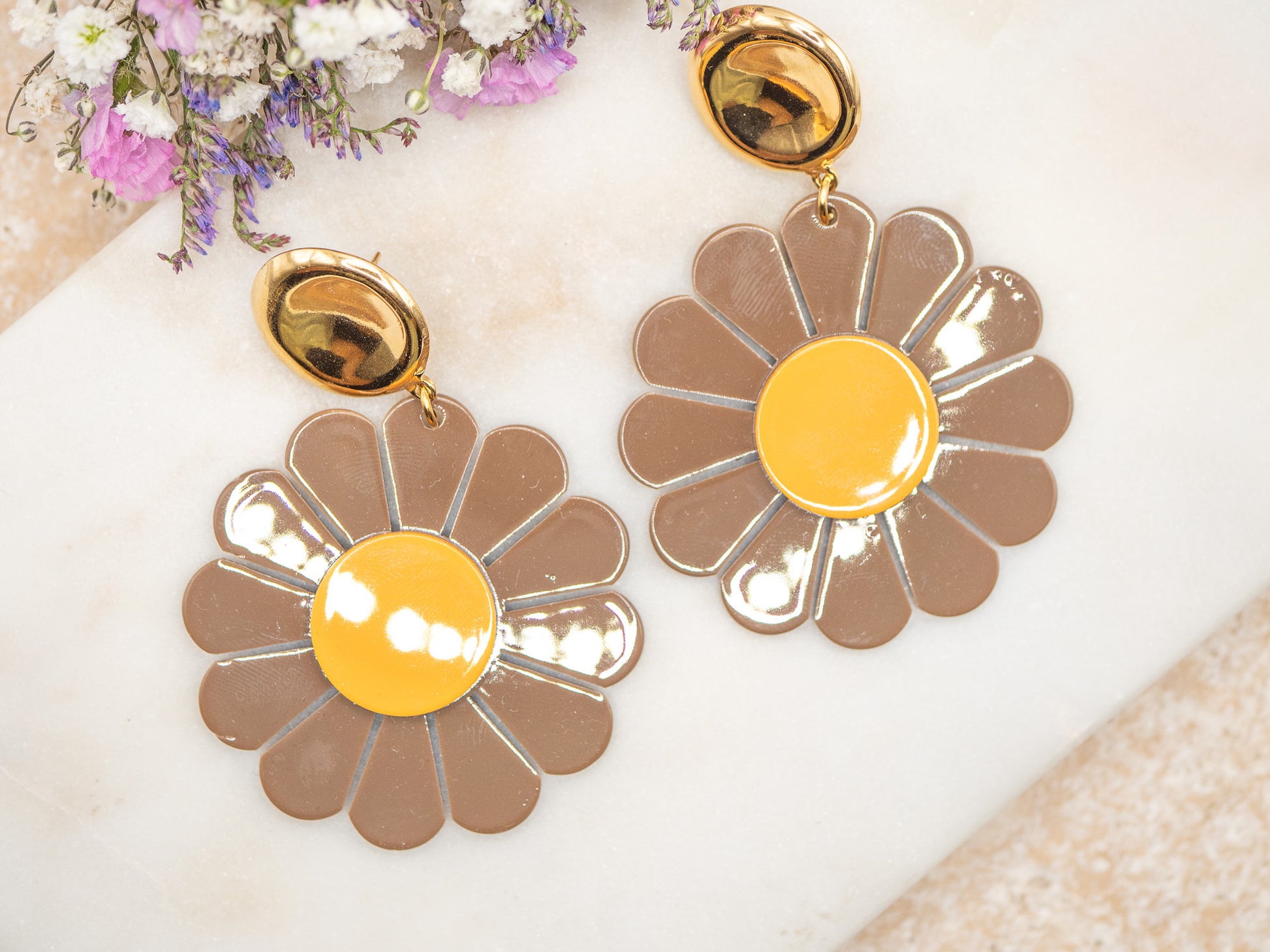 Icôniques et ludiques, Chelsea Flower sont des boucles d’oreilles qui rendent hommage à l’esprit effervescent du Swinging London et à Mary Quant, créatrice de la mini-jupe et des motifs pop. Avec leur design marguerite aux pétales chocolat, elles incarnent l’énergie joyeuse et graphique des années 60.