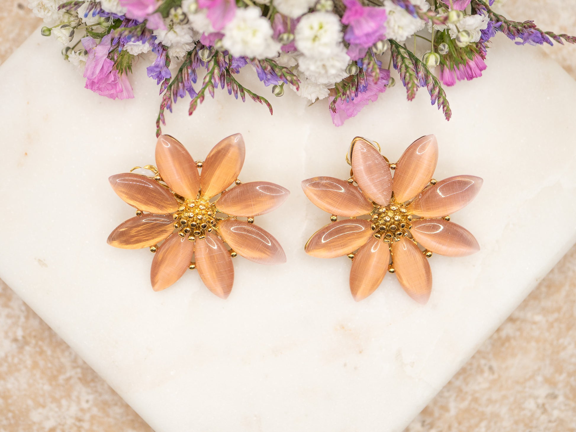 Chaque pétale œil de chat en résine rose capte la lumière avec une douceur nacrée irrésistible, pendant que le cœur doré, en acier inoxydable , évoque un soleil miniature — délicieusement kitsch, furieusement chic.