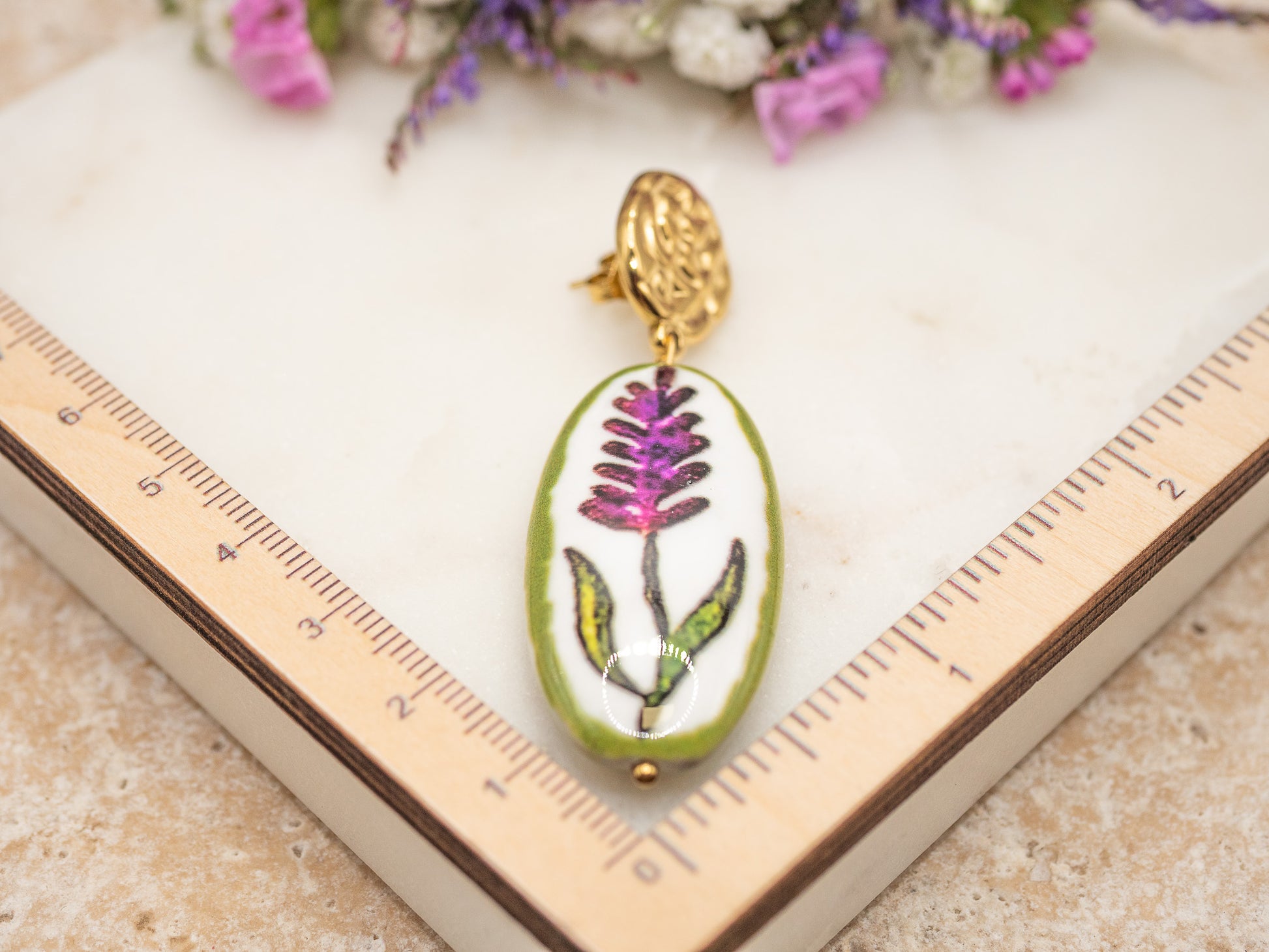 Un hommage stylisé à l’effervescence florale du Swinging London, ces boucles d’oreilles Dandie affichent une plaque ovale en céramique émaillée, illustrée d’un motif floral rose fuchsia et vert chartreuse, façon lavande pop. Le tout est suspendu à un clou doré texturé comme un petit médaillon baroque, clin d’œil aux bijoux fantasques de la jeunesse arty de Chelsea en 1971.