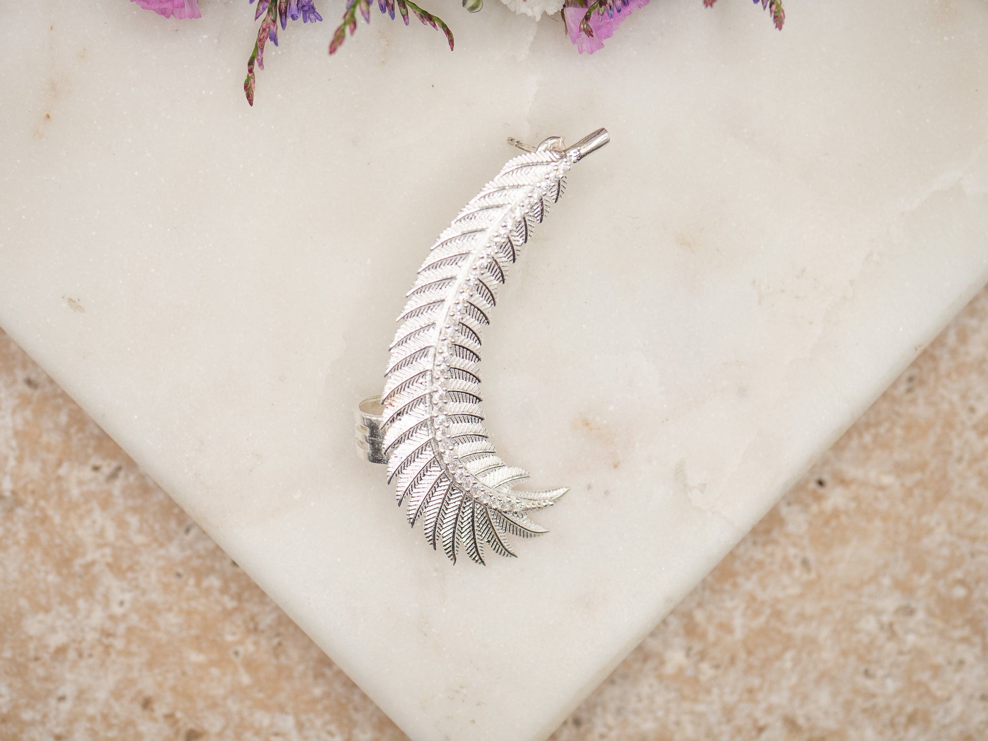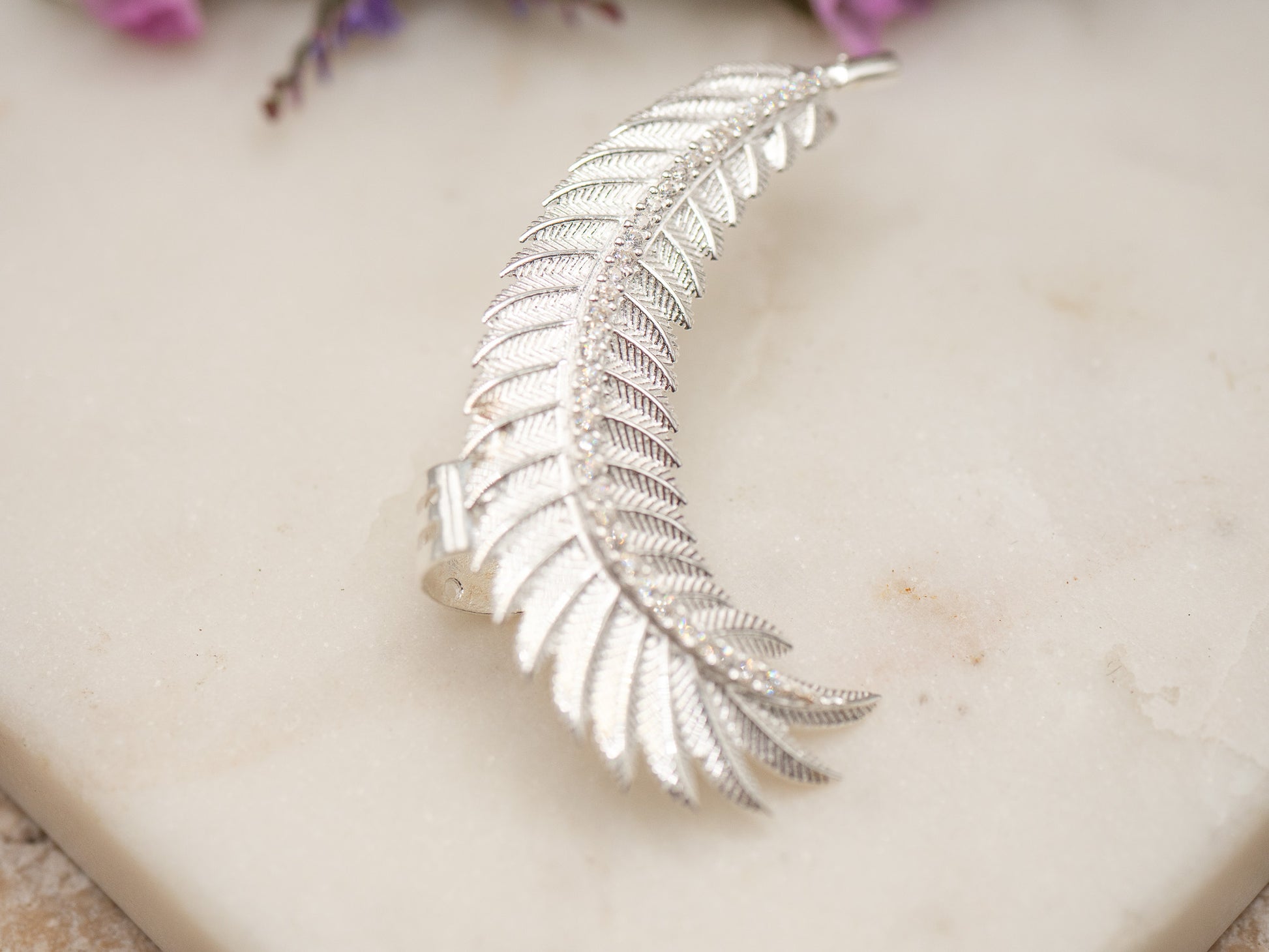 Une seule boucle, et tout est dit. La boucle d’oreille Featherly se porte comme un manifeste. En argent, elle dessine une plume stylisée, texturée, et soulignée de strass pour attraper la lumière avec élégance. À la fois statement et délicate, elle épouse la forme de l’oreille pour un effet sculptural très couture.
