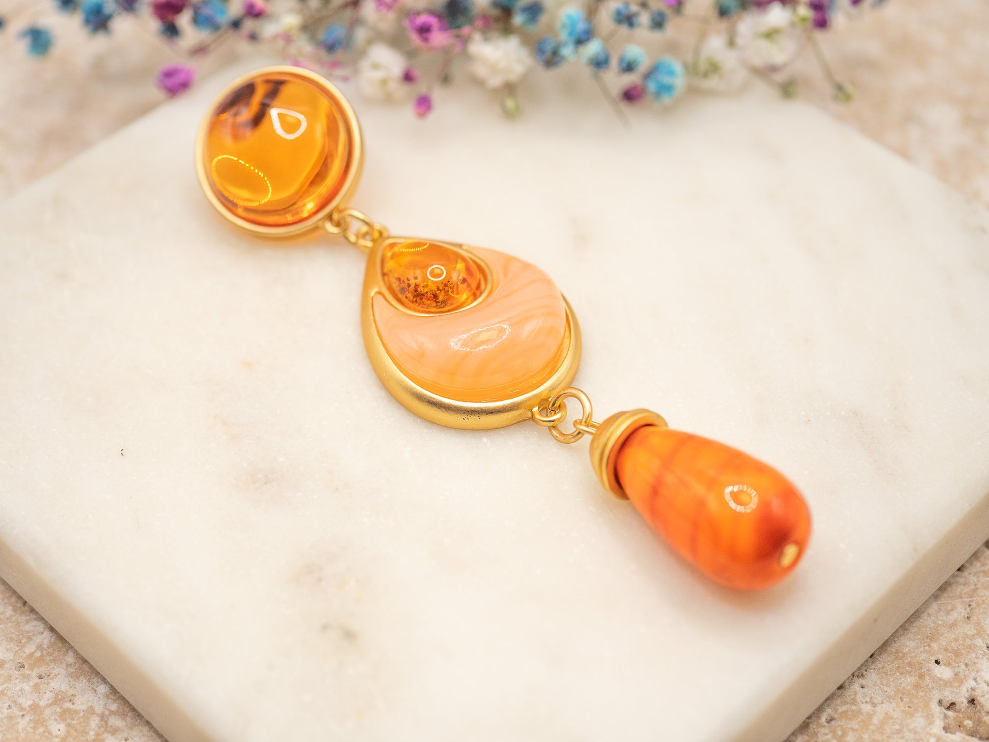 Composées de trois segments reliés par une monture dorée lumineuse, elles s’ouvrent sur un cabochon rond à effet marbré, suivi d’une élégante goutte en forme de larme, avant de s’achever sur une perle tombante orange feu, presque hypnotique. Leur design allongé affine le port de tête et attire immédiatement l’œil — une véritable touche d’audace maîtrisée.
