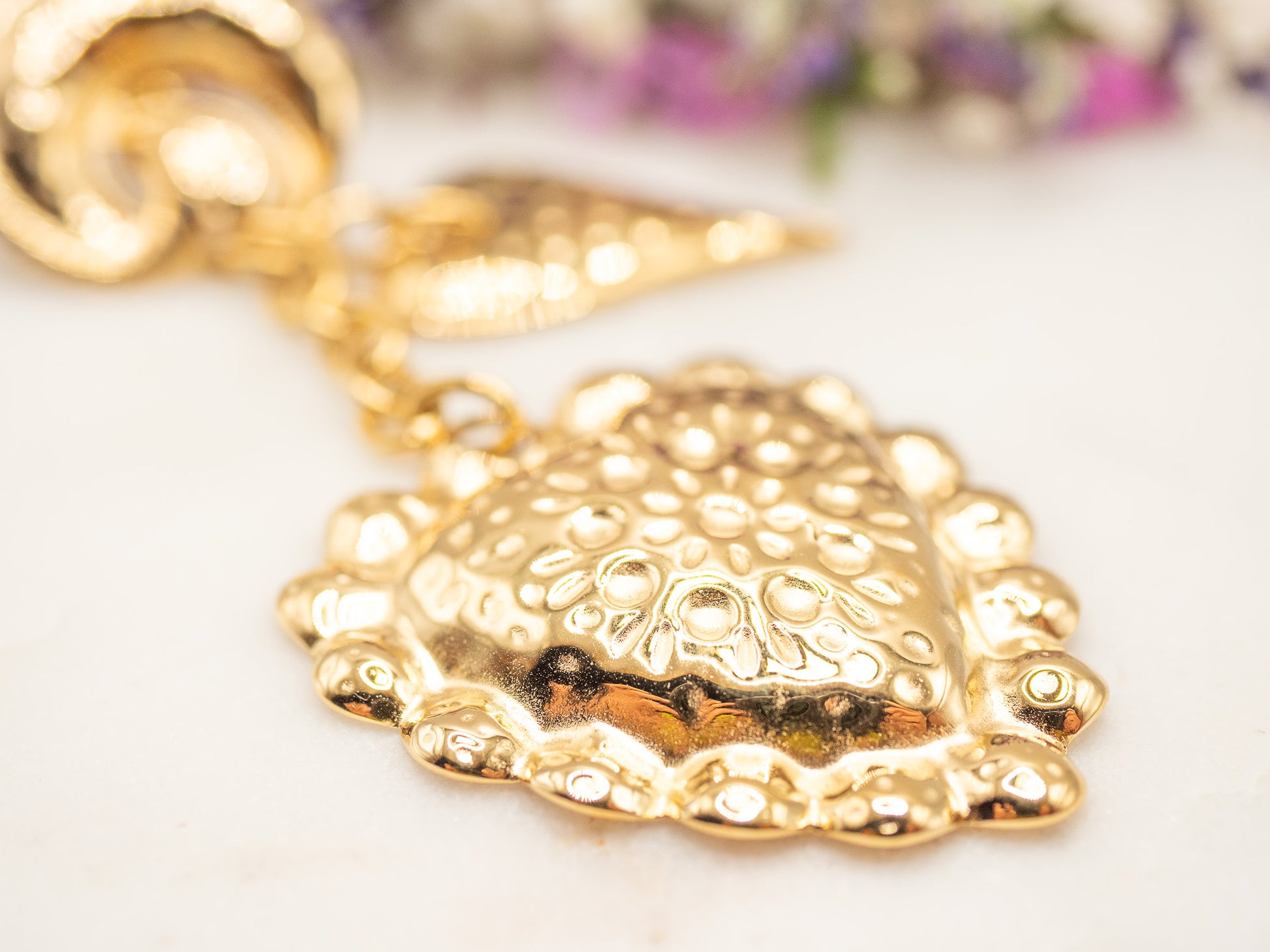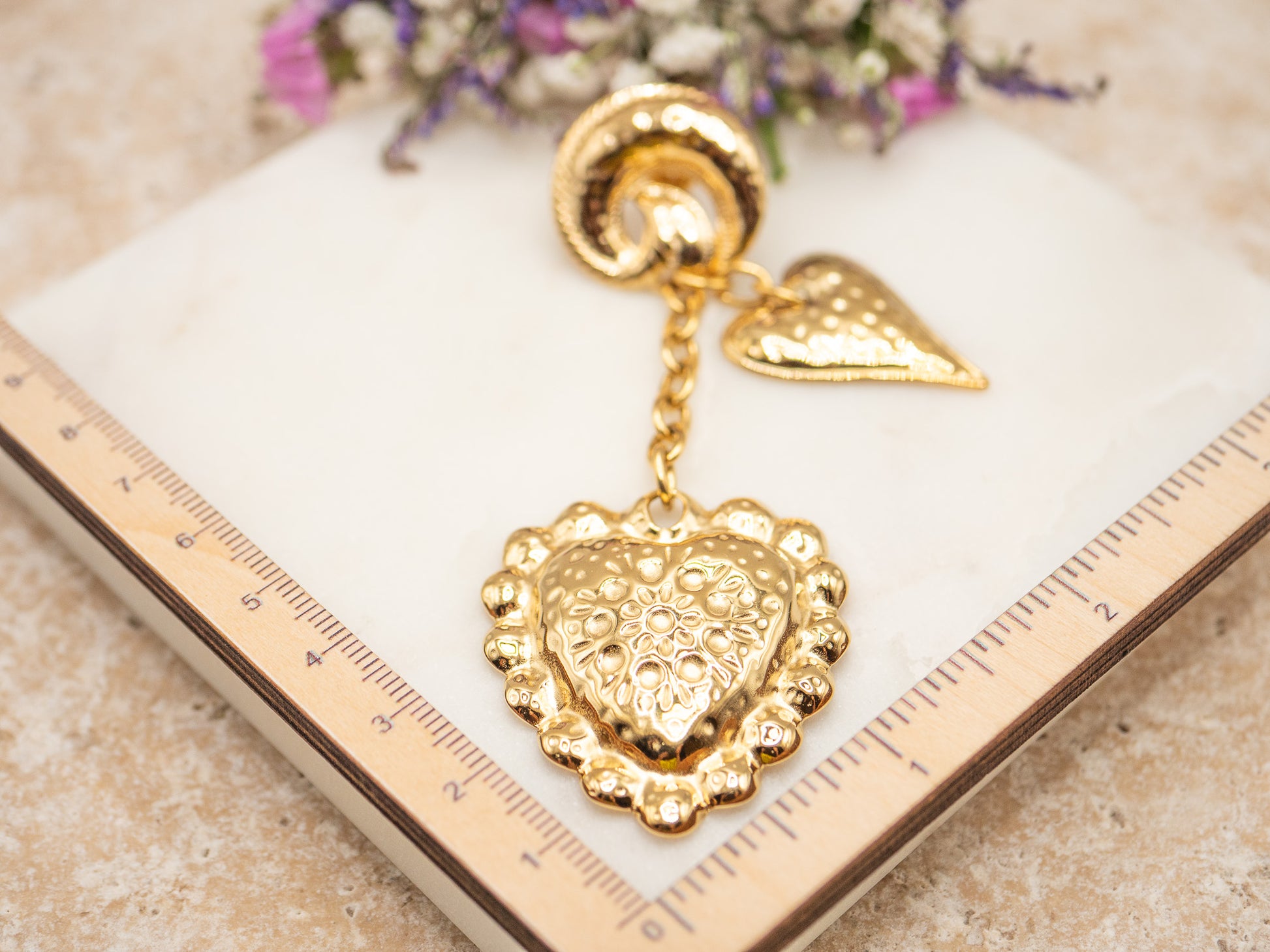 La texture martelée et les détails ciselés évoquent les ex-voto et les bijoux anciens, tout en affirmant une modernité flamboyante. Chaque cœur semble battre au rythme de celle qui les porte, accompagnant les mouvements avec une élégance solaire.