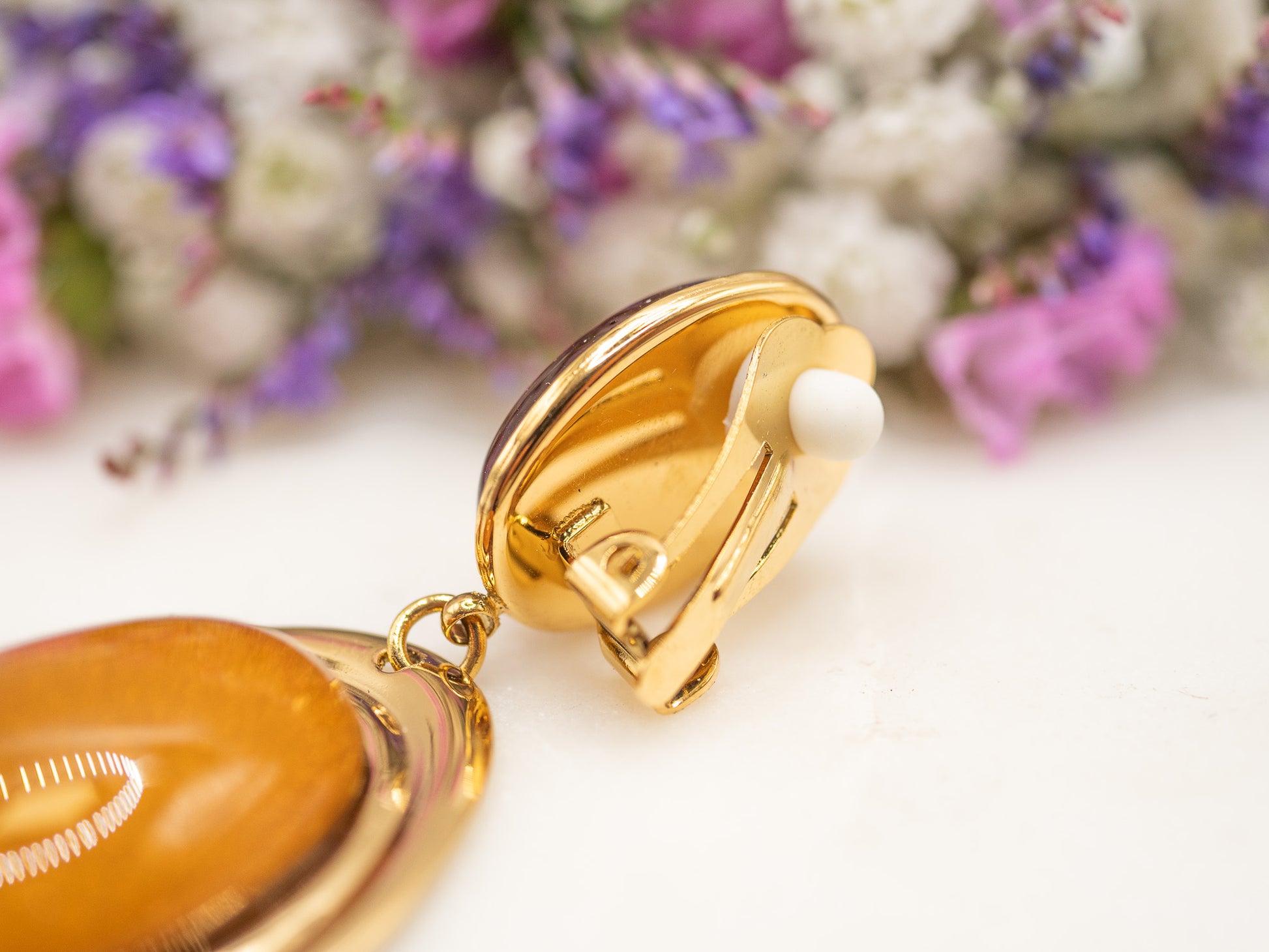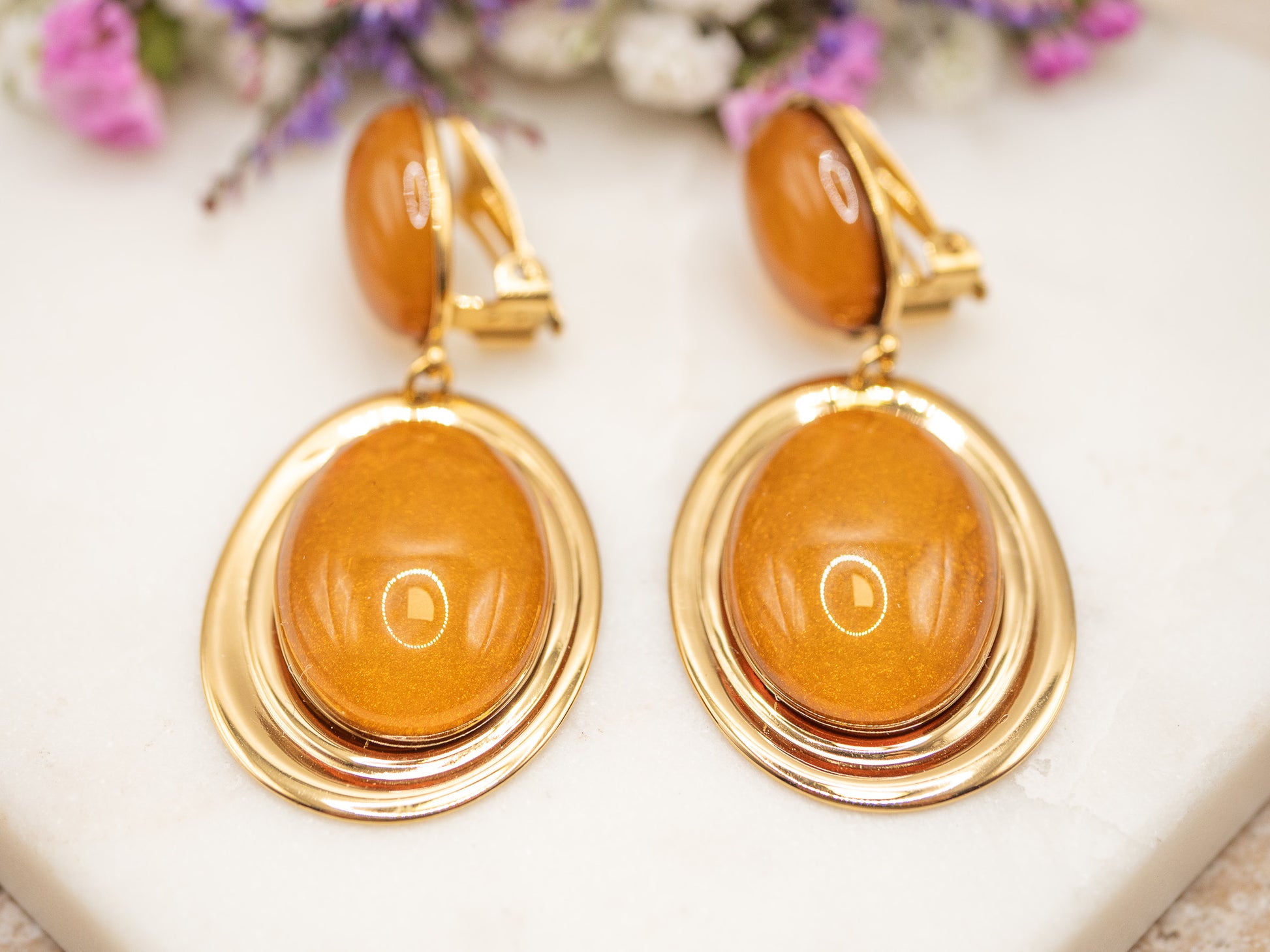 Avec leur forme ovale généreuse et leur teinte dorée ambrée, les boucles Honeydrop ont un charme rétro assumé. Le cabochon en résine bombé et lumineux semble couler dans son écrin en acier inoxydable, comme une goutte figée dans le temps. Fermoir clip pour oreilles percées ou non.