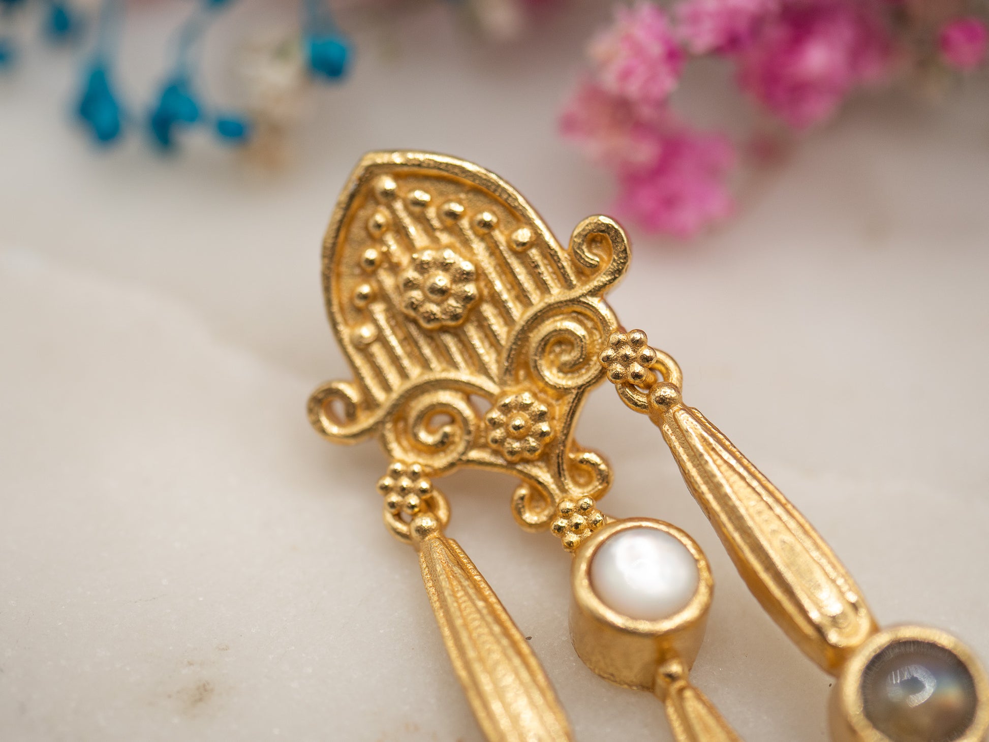 Les boucles Juana semblent tout droit inspirées des ornements majestueux de la cathédrale de Séville. Elles capturent cette richesse architecturale andalouse, entre volutes délicates, détails sculptés et éclats de lumière dorée.