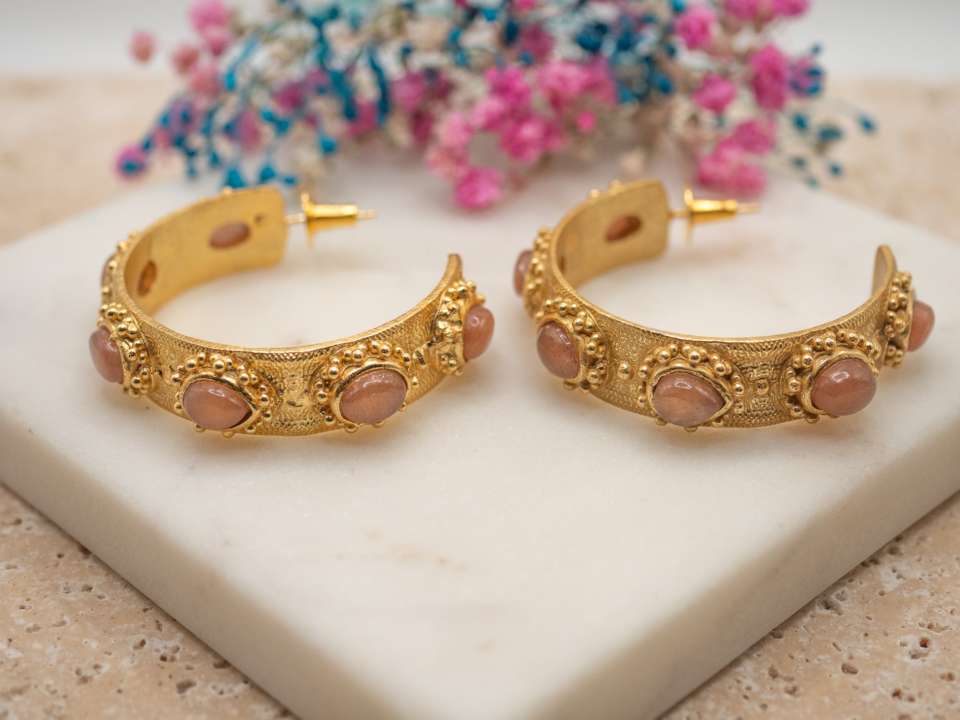 Les créoles Laïa se dévoilent ici dans une version aux nuances rosées poudrées, comme un coucher de soleil sur les toits de Séville. Toujours inspirées de l’univers artistique andalou, elles conservent leur structure baroque dorée tout en s’habillant d’une pierre plus douce, plus romantique.