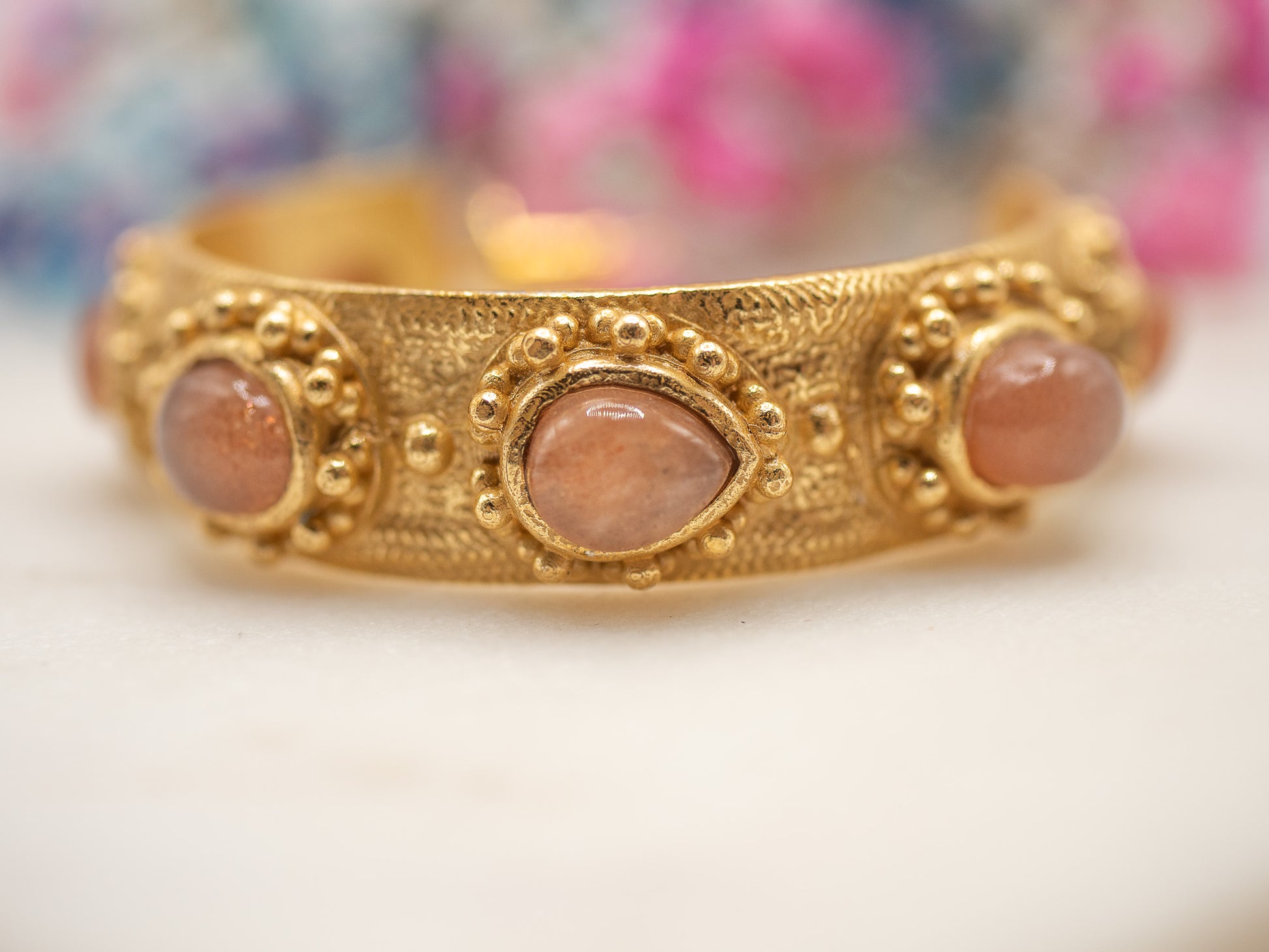 Le contraste entre l’or texturé richement travaillé et la douceur rosée des pierres crée un équilibre irrésistible : affirmé mais délicat, sophistiqué mais lumineux.