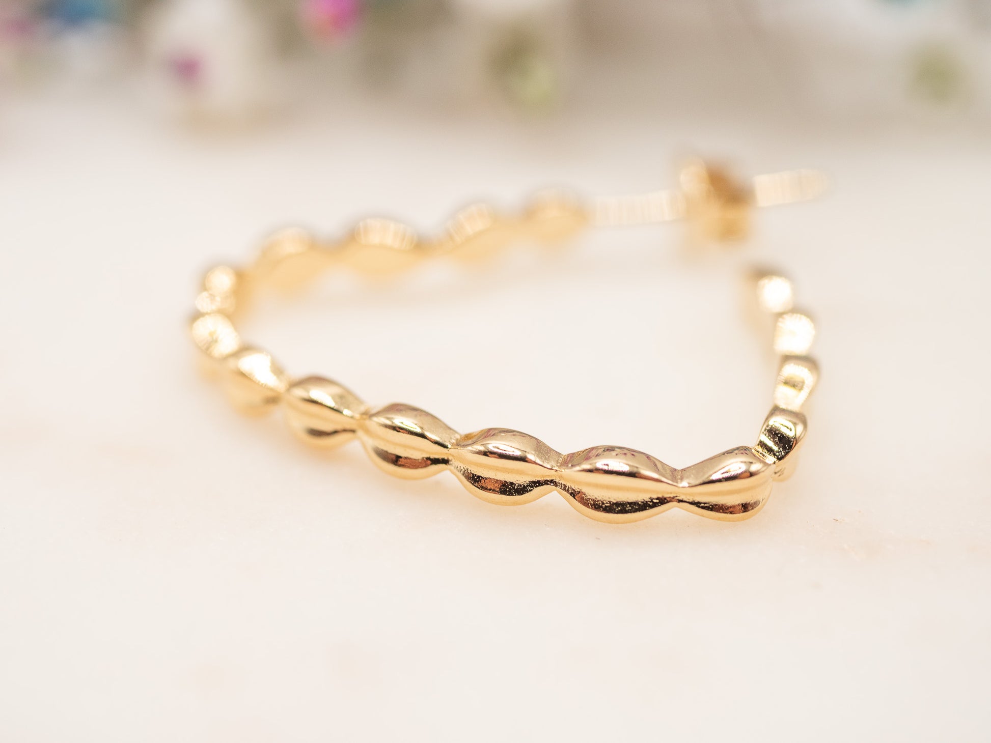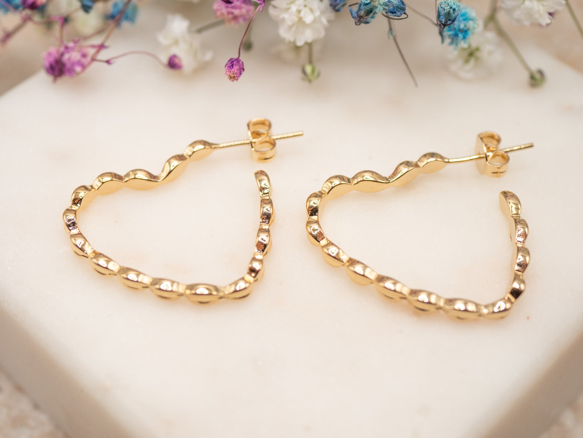 Ces créoles en plaqué or 18 carats et en forme de cœur revisitent le romantisme avec une ligne ondulée et organique, comme sculptée dans l’or en fusion.