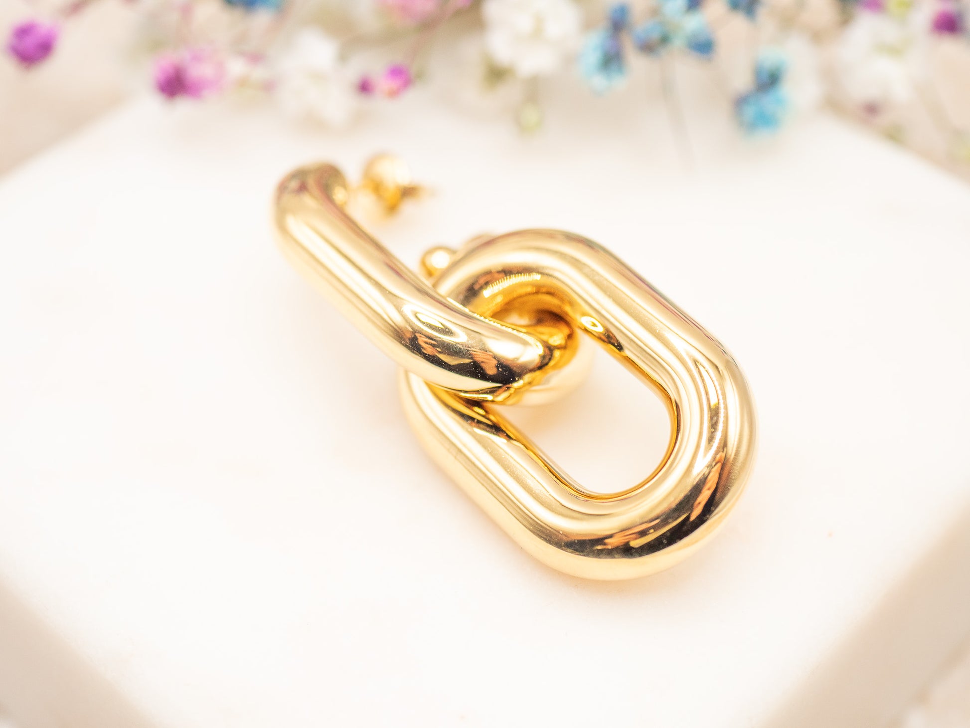 London Link est un bijou qui affirme : « Je suis là, et je ne passe pas inaperçue. » Deux maillons oversize au design lisse et ultra lumineux s’entrelacent pour former une boucle d’oreille à la fois graphique, audacieuse et terriblement stylée.