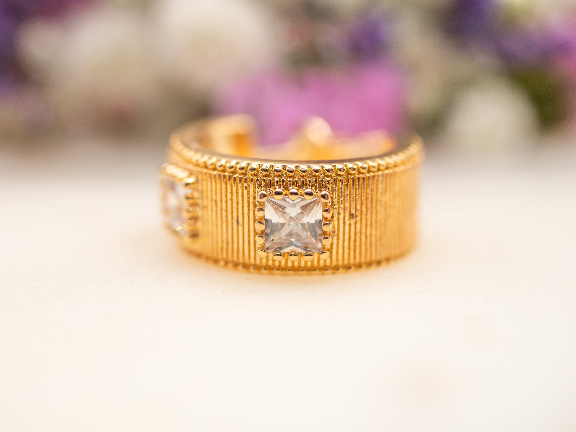 Le plaqué or 18 carats vient sublimer la base nervurée, tandis que trois zirconiums carrés s'incrustent sur chaque créole, créant un jeu de lumière presque architectural. Une allure audacieuse, mais précise. Chic sans effort. Élégant sans être lisse.
