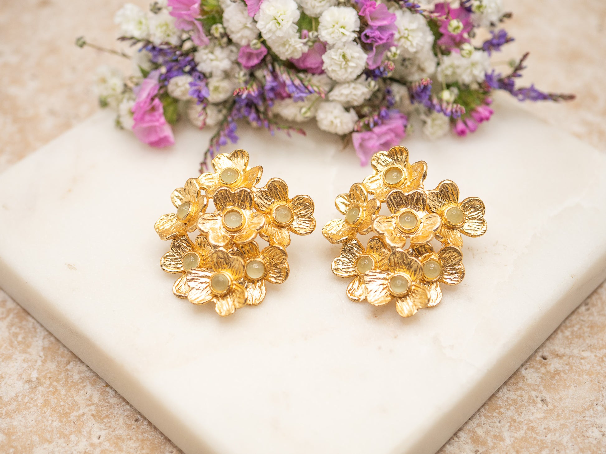 Un jardin sur les lobes. Marigold est une déclaration d’amour aux années Mary Quant, à ces filles qui dessinaient des marguerites sur leurs cuisses avec du khôl noir en attendant un concert dans Camden. Une cascade de petites fleurs dorées, en relief texturé, avec un cœur en pierre lisse vert d’eau, presque céladon. On croirait voir une broche de grand-mère transformée en manifeste mode.