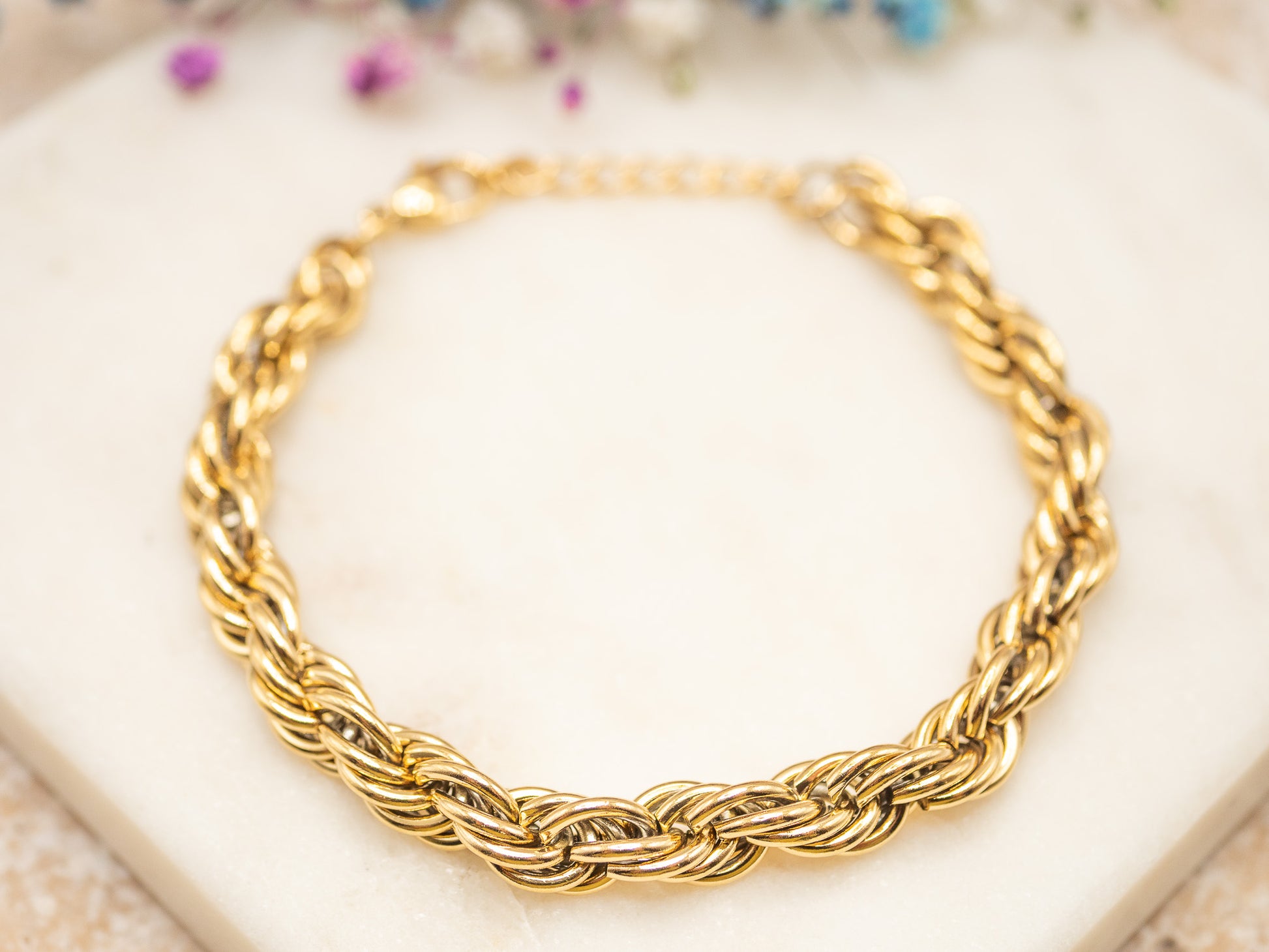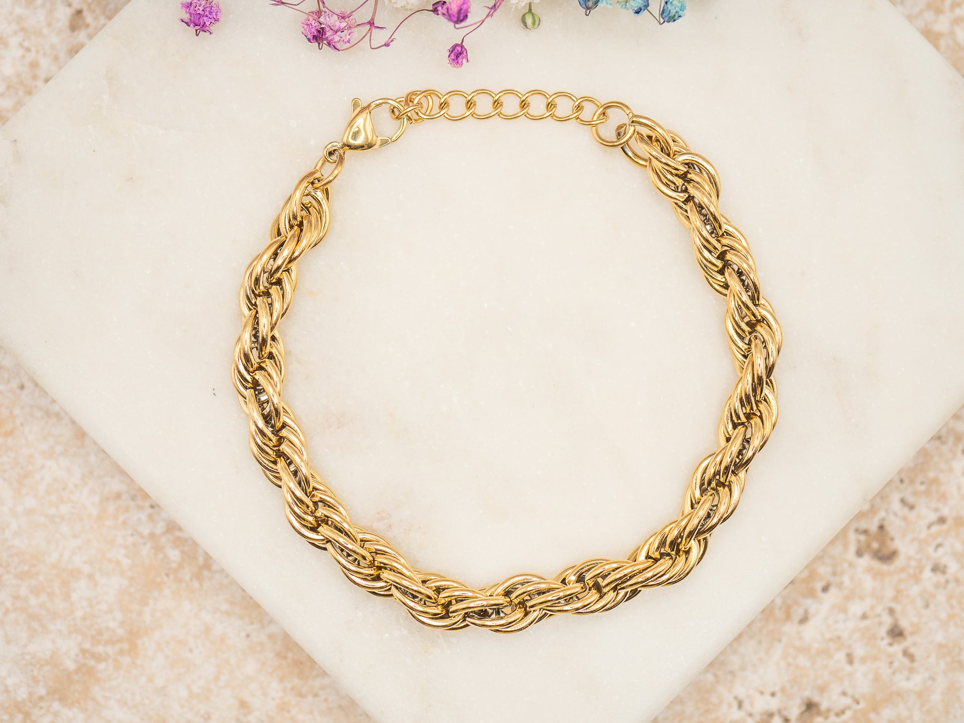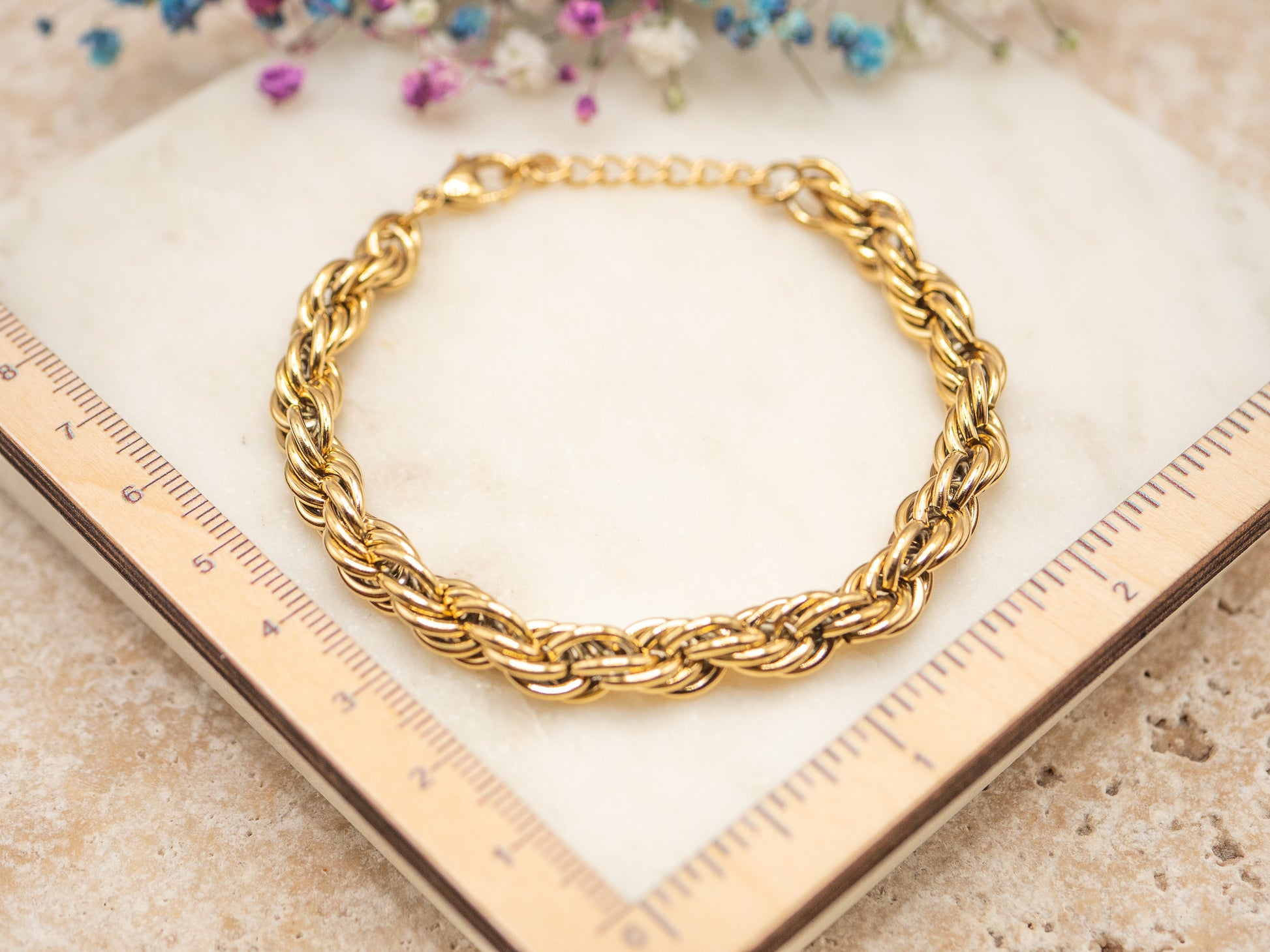 Sa finition en plaqué or 18 carats lui donne un éclat riche et chaud, parfait pour sublimer toutes les carnations. Confortable au poignet, ajustable grâce à sa chaînette d’extension, ce bijou minimaliste mais travaillé s’adapte à tous les styles — du plus épuré au plus sophistiqué.