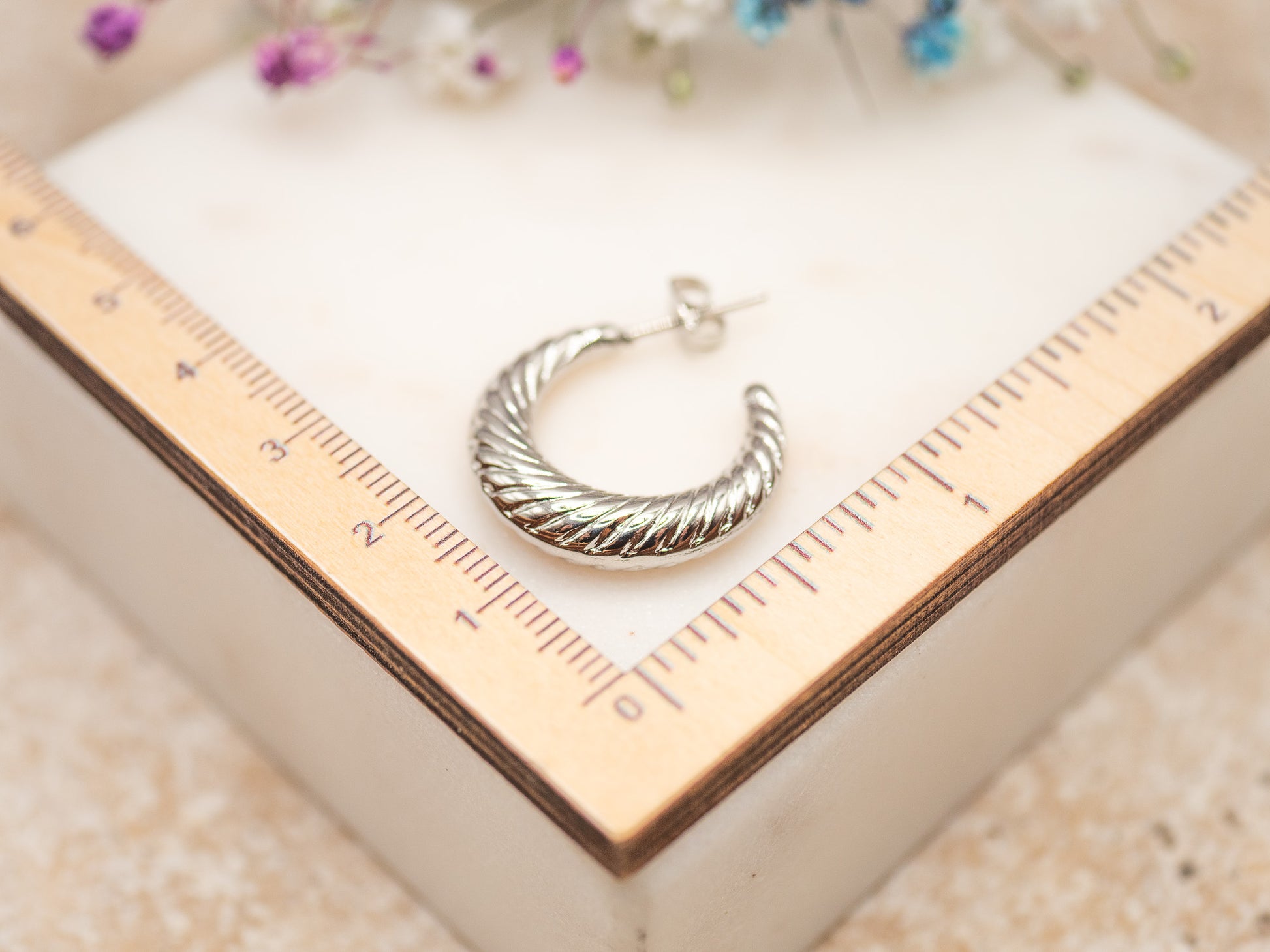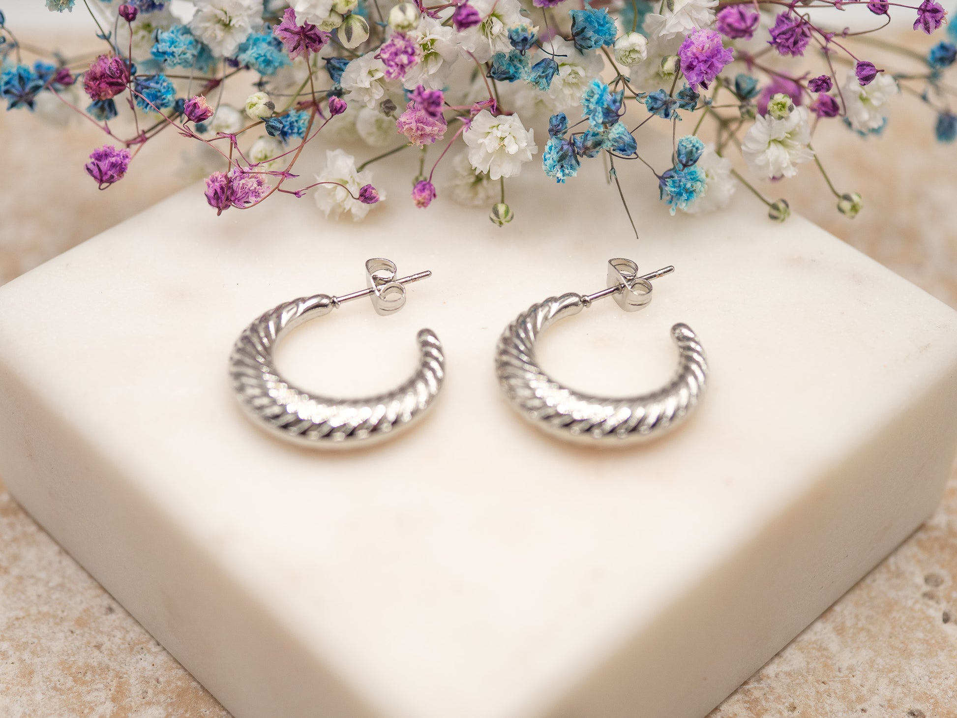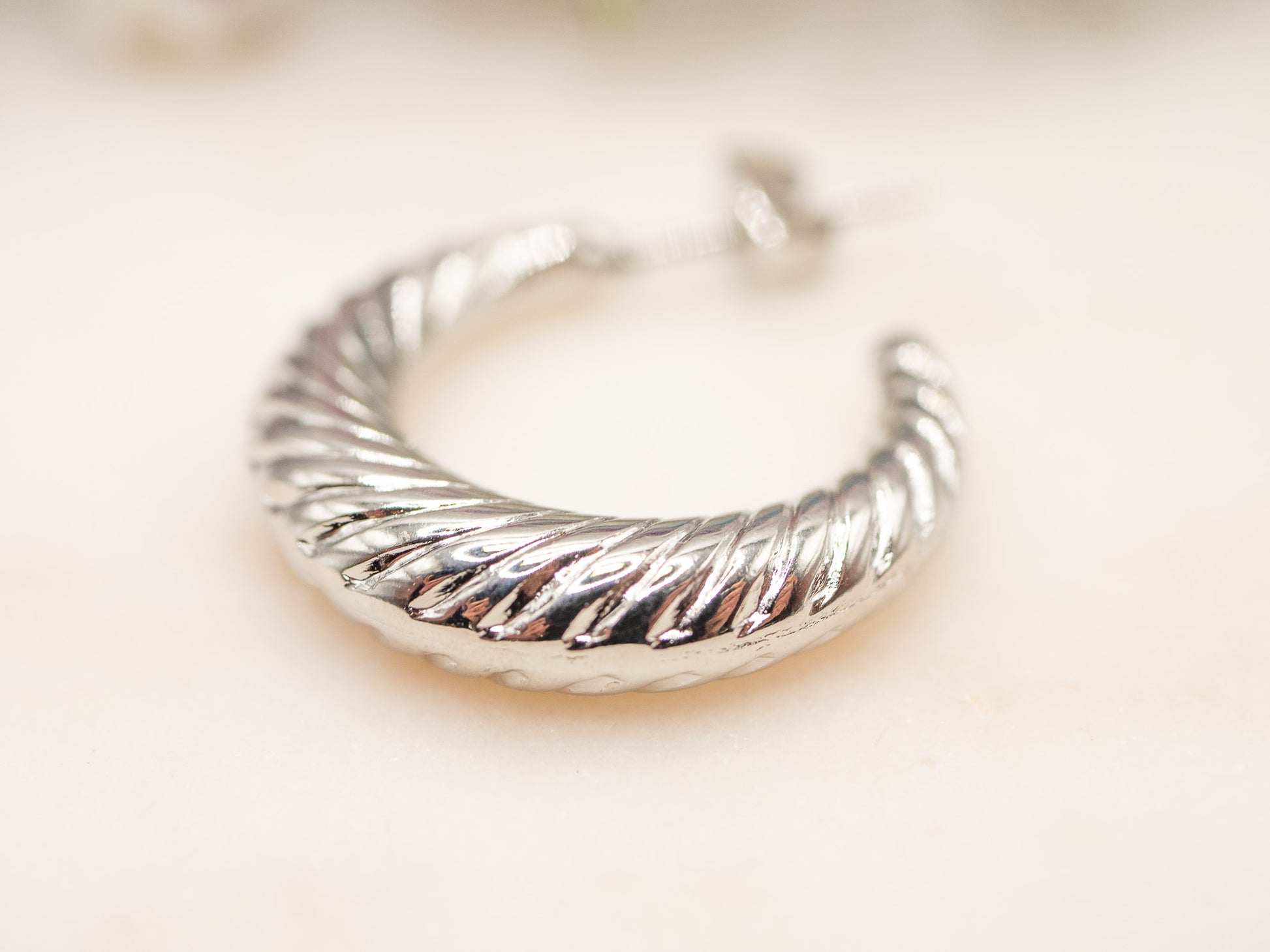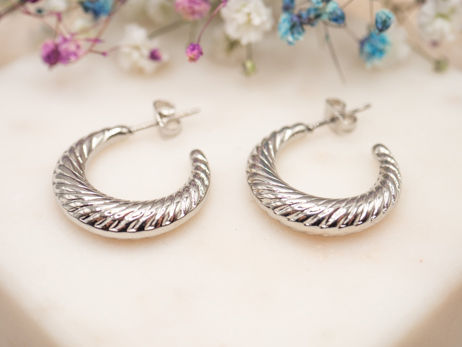 Ces créoles argentées torsadées, tout en mouvement, rappellent les vieilles rampes d’escalier en fonte ou les manches de couverts d’argent de l’époque édouardienne.
