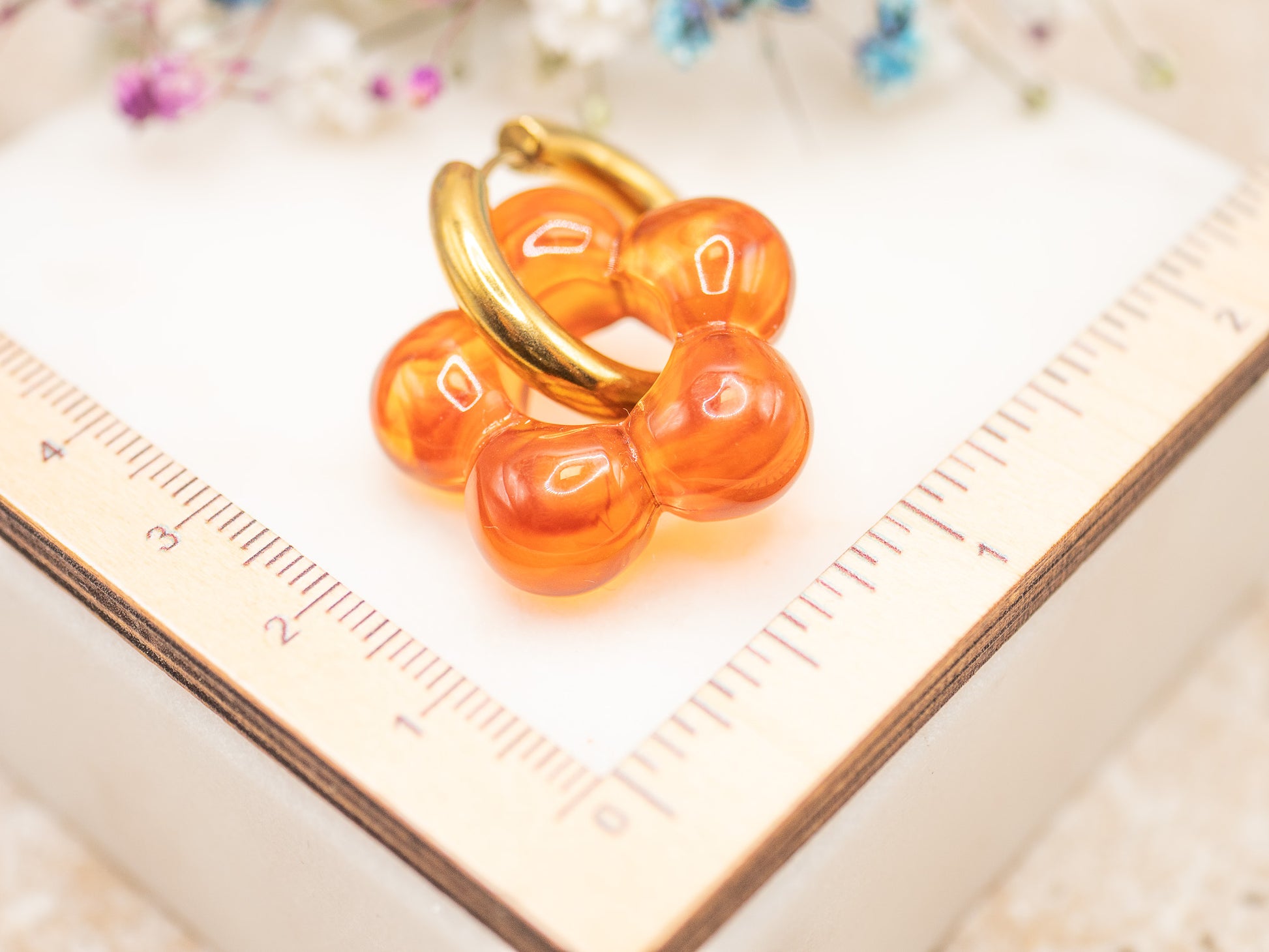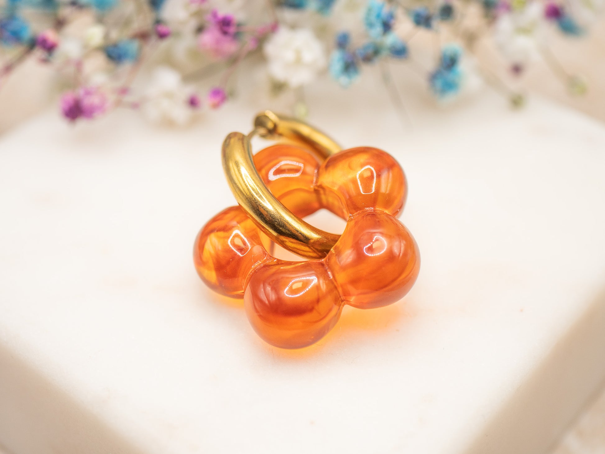 Inspirées des confitures d’agrumes, et des décos rétro de Notting Hill, ces boucles jouent la transparence vitaminée. Chaque bulle en résine orange évoque une goutte de lumière colorée, un bonbon fondu, ou un clin d’œil aux années 70.