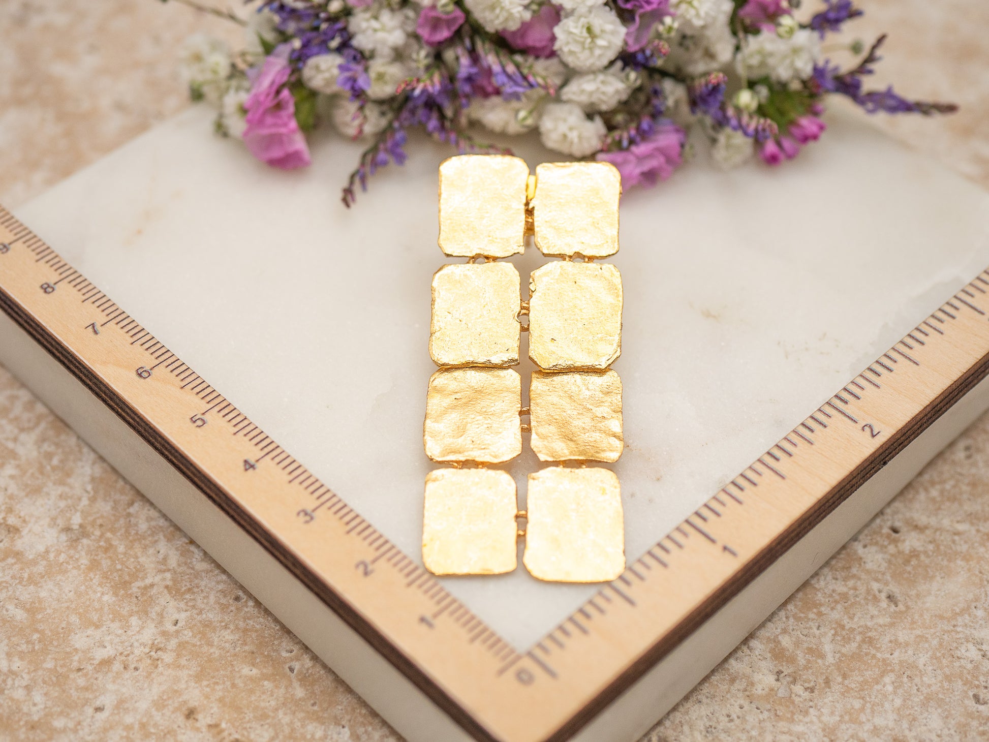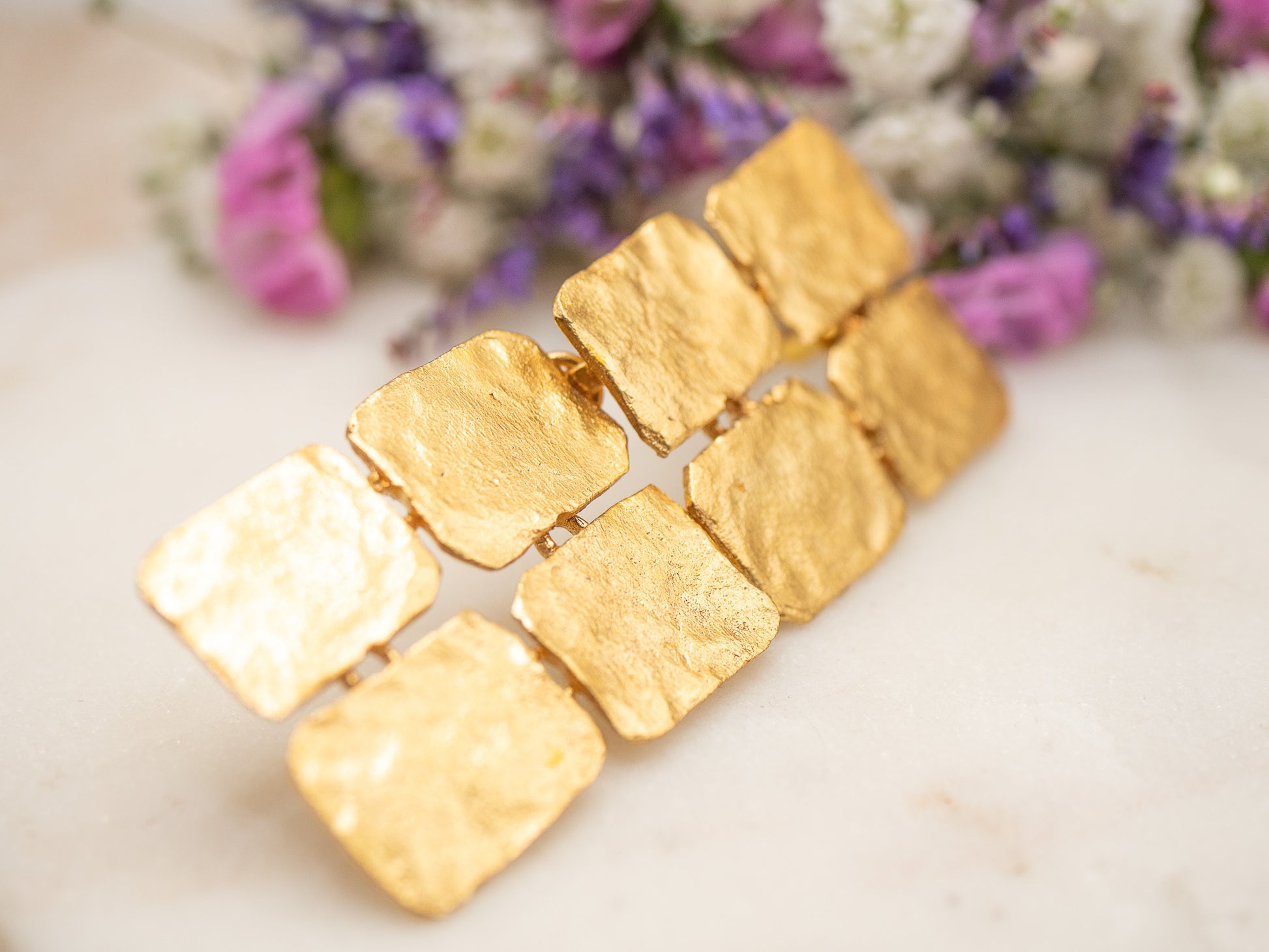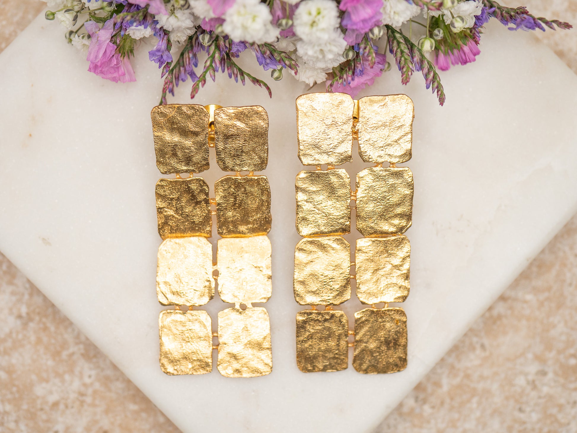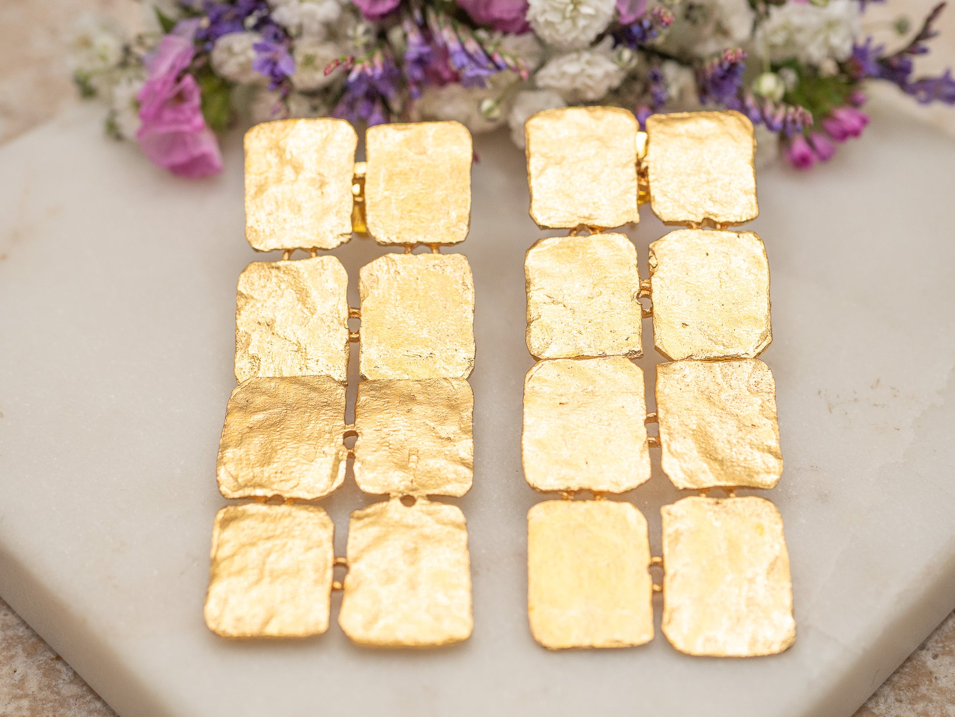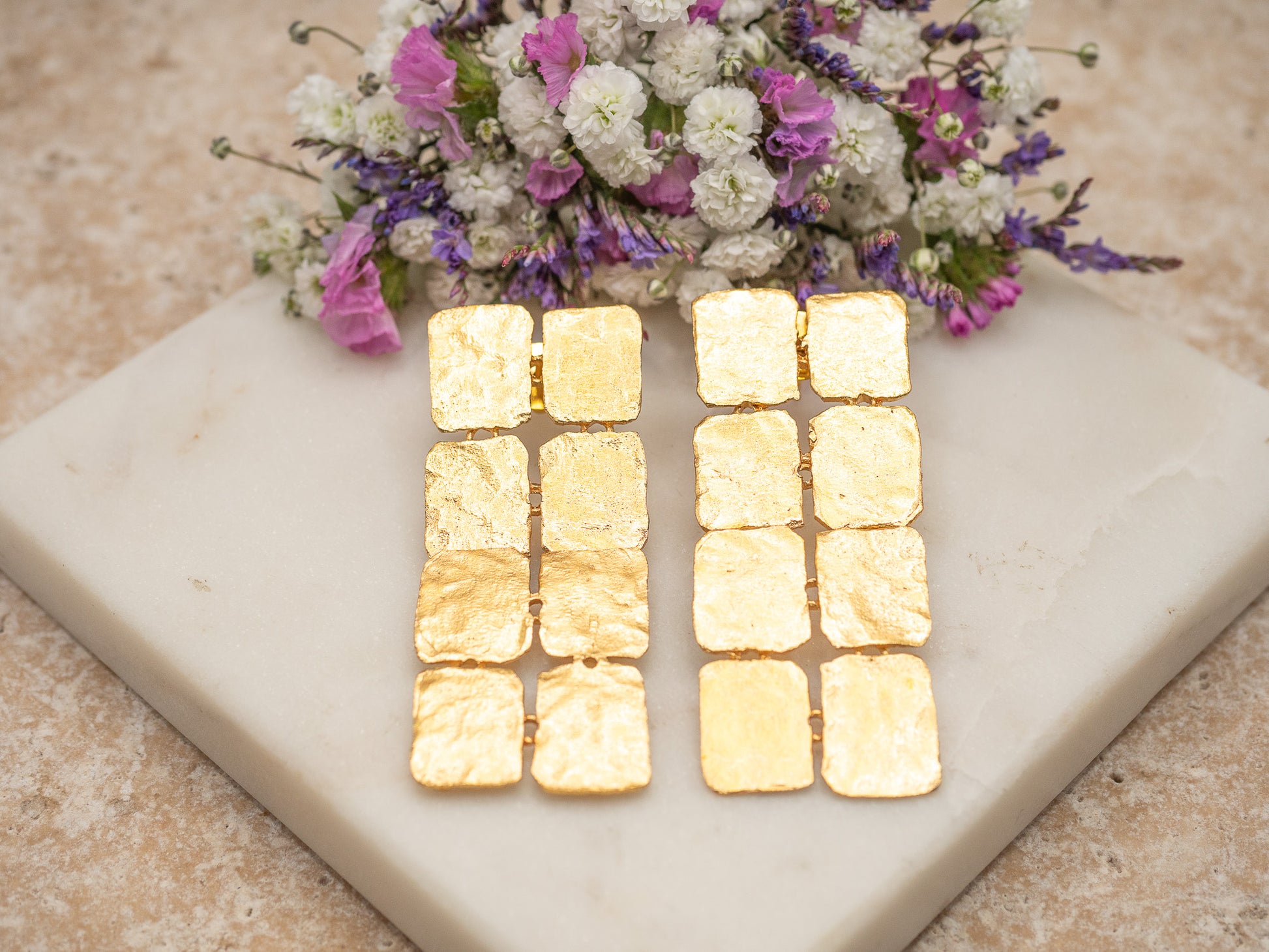 Leur texture irrégulière évoque l'artisanat des bijoux sculptés à la main, entre modernisme anguleux et sensualité vintage. Elles bougent avec vous, comme un rideau d’or qui accompagne chaque pas — on entend presque les talons sur les pavés mouillés de Londres.