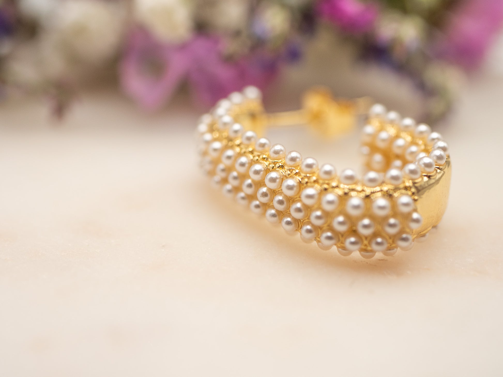 Les boucles Pearly réinventent la créole classique avec une touche couture et une dose de fantaisie rétro. Leur structure dorée en acier inoxydable, habillée de fines perles nacrées délicatement disposées en double rang, évoque l’audace raffinée des silhouettes londoniennes des années 70, entre extravagance et élégance.