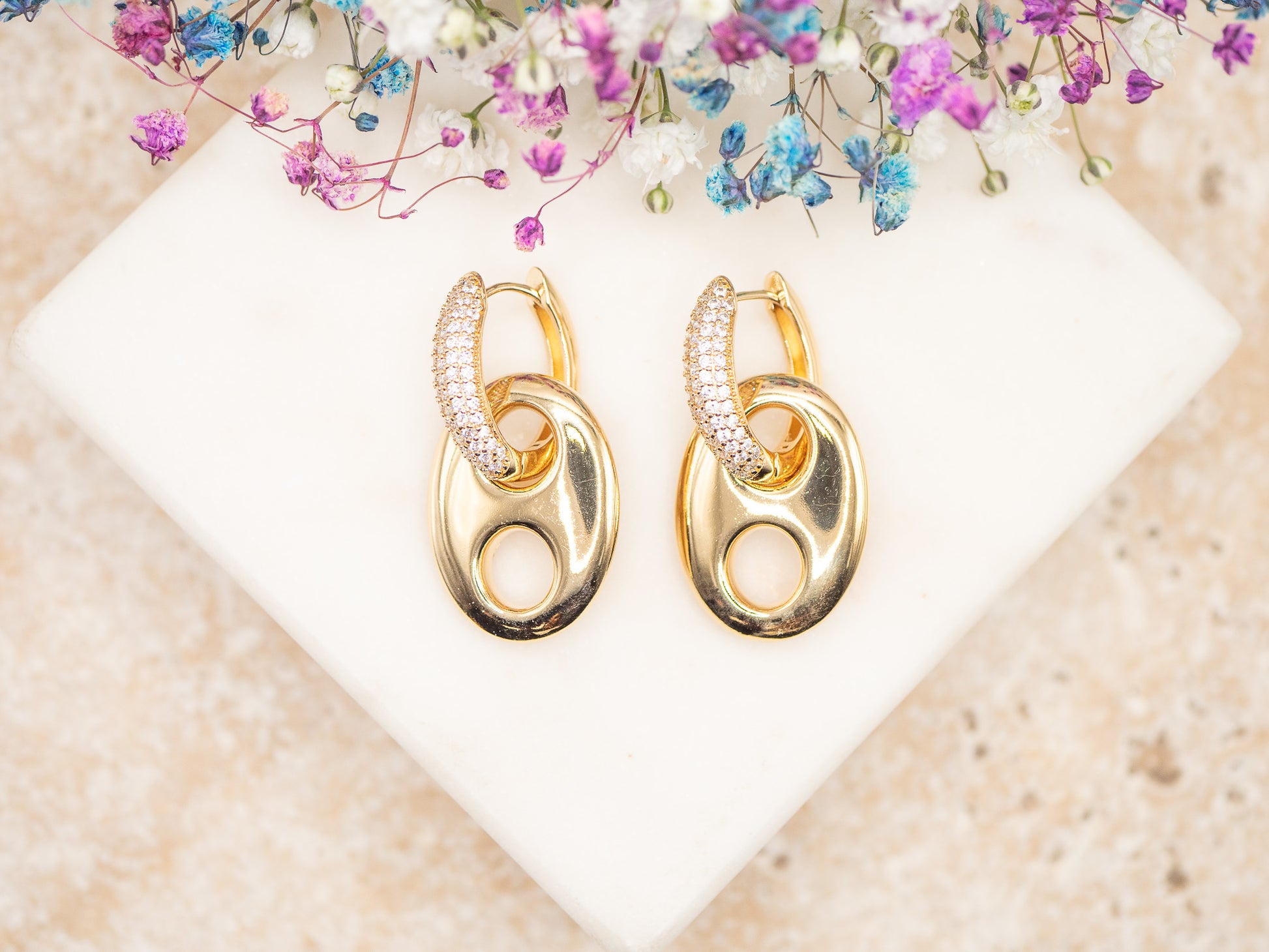 Avec leur silhouette sculpturale inspirée des formes organiques et leur duo de textures (doré miroir & pavage scintillant), ces boucles font rimer design contemporain et brillance festive.