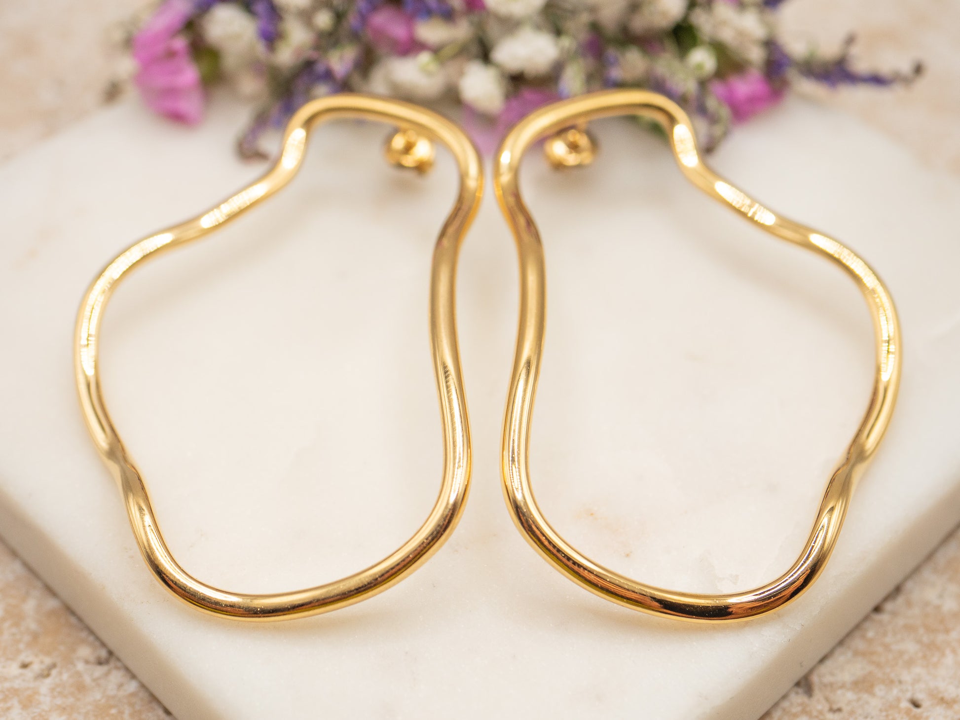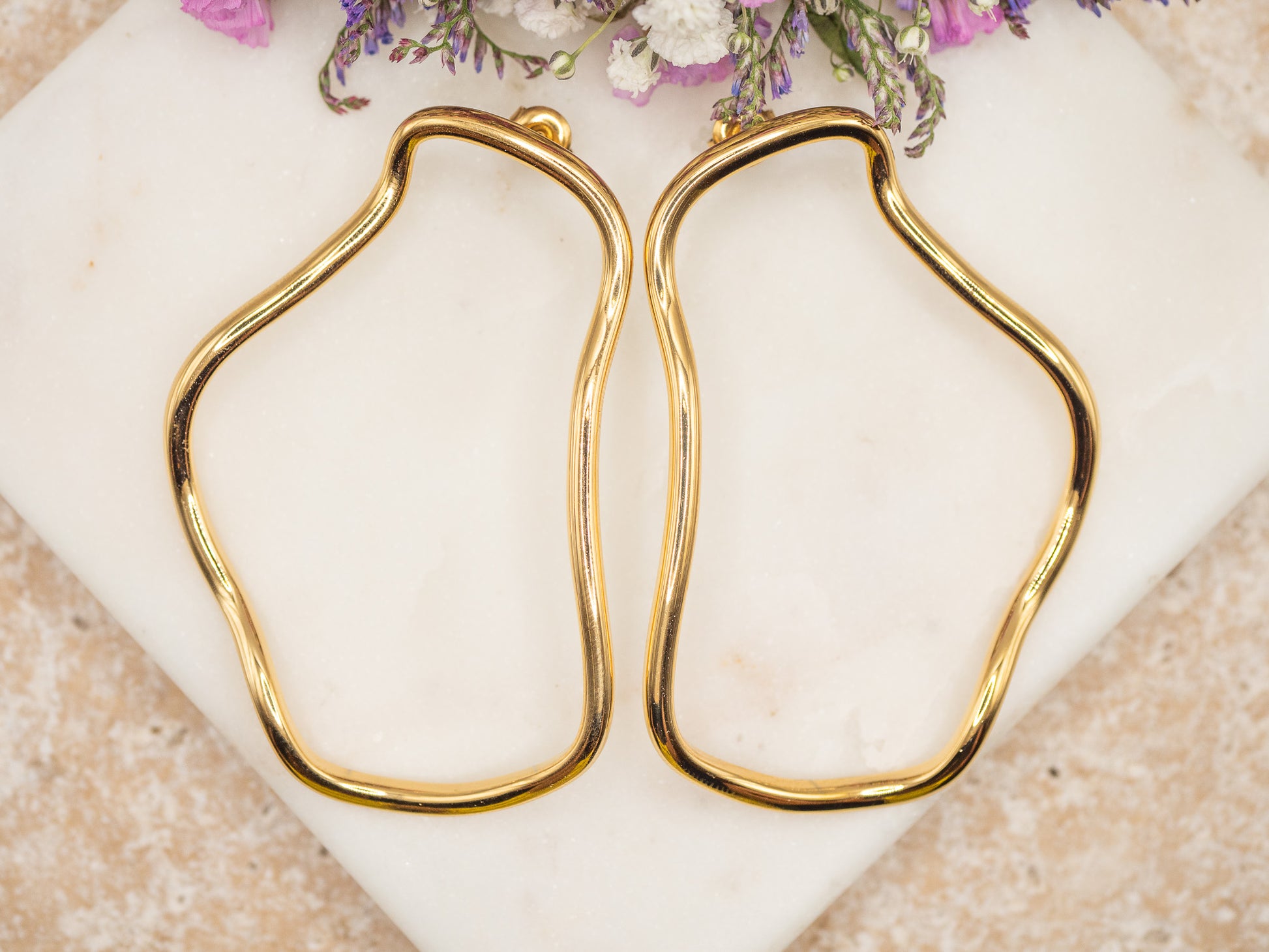 Shapely est une ode à la liberté des formes et à la féminité sans contraintes. Ces boucles d’oreilles dorées en plaqué or 18 carats dessinent une silhouette fluide et irrégulière, inspirée des lignes naturelles du corps, comme un clin d'œil aux mouvements artistiques organiques qui ont fleuri dans le Londres des années 70.