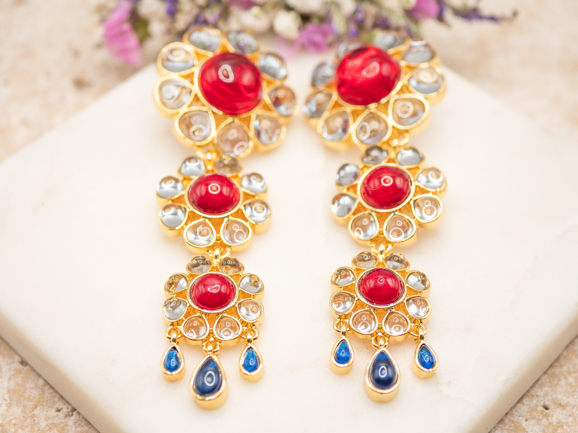 Trois fleurs stylisées se déploient en cascade, chacune centrée autour d’une résine rouge framboise profonde, entourée de cabochons aux reflets lunaires. Les extrémités sont soulignées de gouttes bleu nuit, apportant une touche finale précieuse, comme une larme de saphir au creux de la lumière.