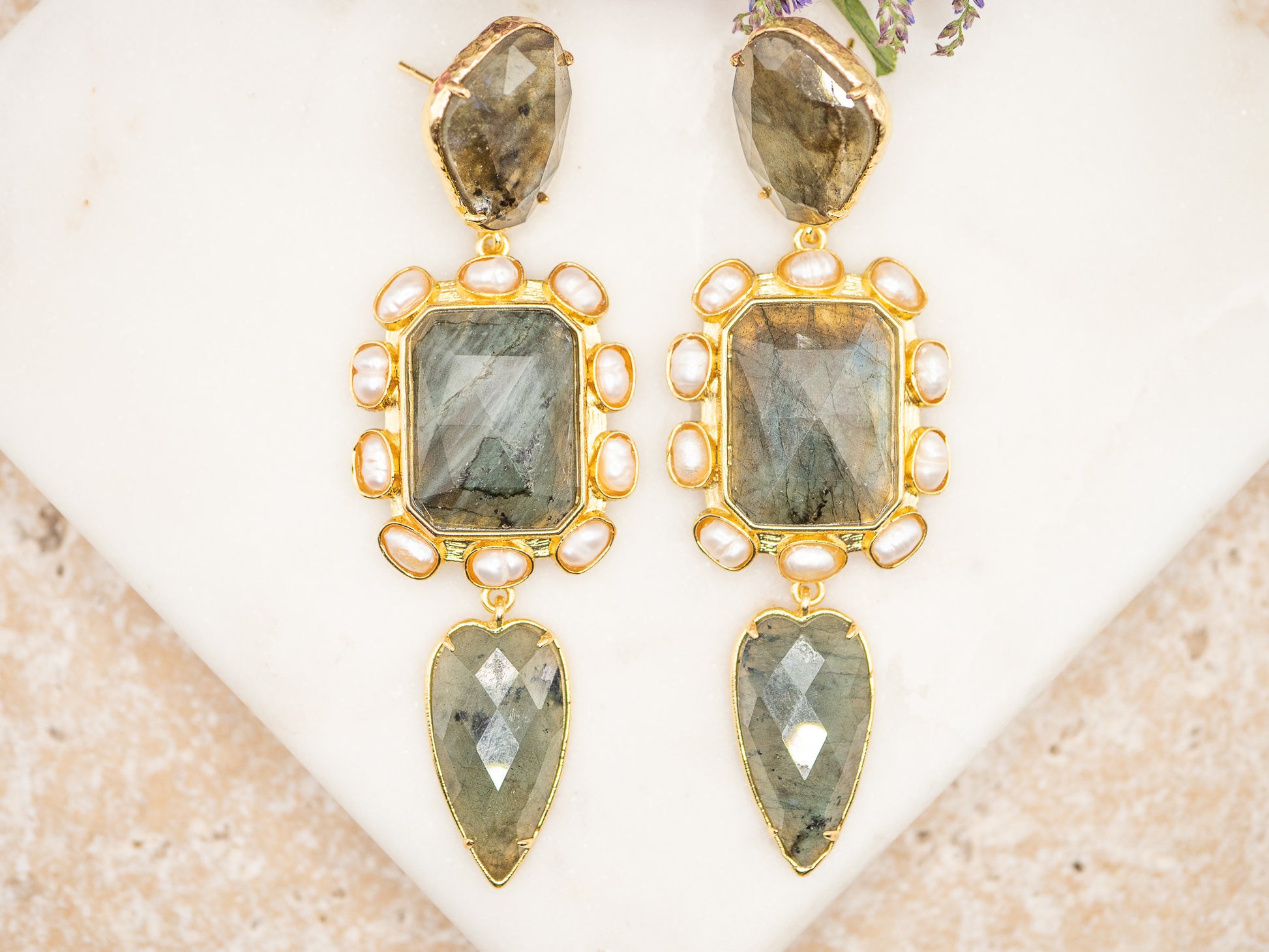 Composées de trois pierres de labradorite facettée, elles révèlent des reflets bleu-vert irisés selon la lumière, encadrées de perles d’eau douce ovales aux reflets nacrés. Le contraste entre la matière brute de la pierre et la délicatesse perlée crée une harmonie élégante et pleine de caractère.