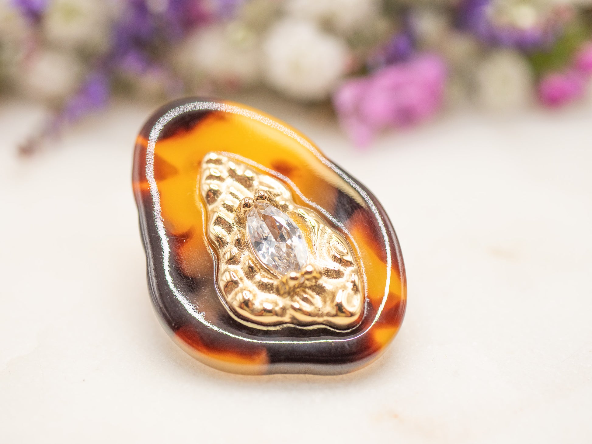 Quand Twiggy rencontre un twist arty ! Les boucles Twiggle empruntent à l’imprimé écaille sa chaleur vintage, et à l’art brut une liberté de forme délicieusement imparfaite. En leur centre, un éclat doré texturé en forme de flamme renferme un cristal marquise, tel un œil brillant au creux de l’écaille.