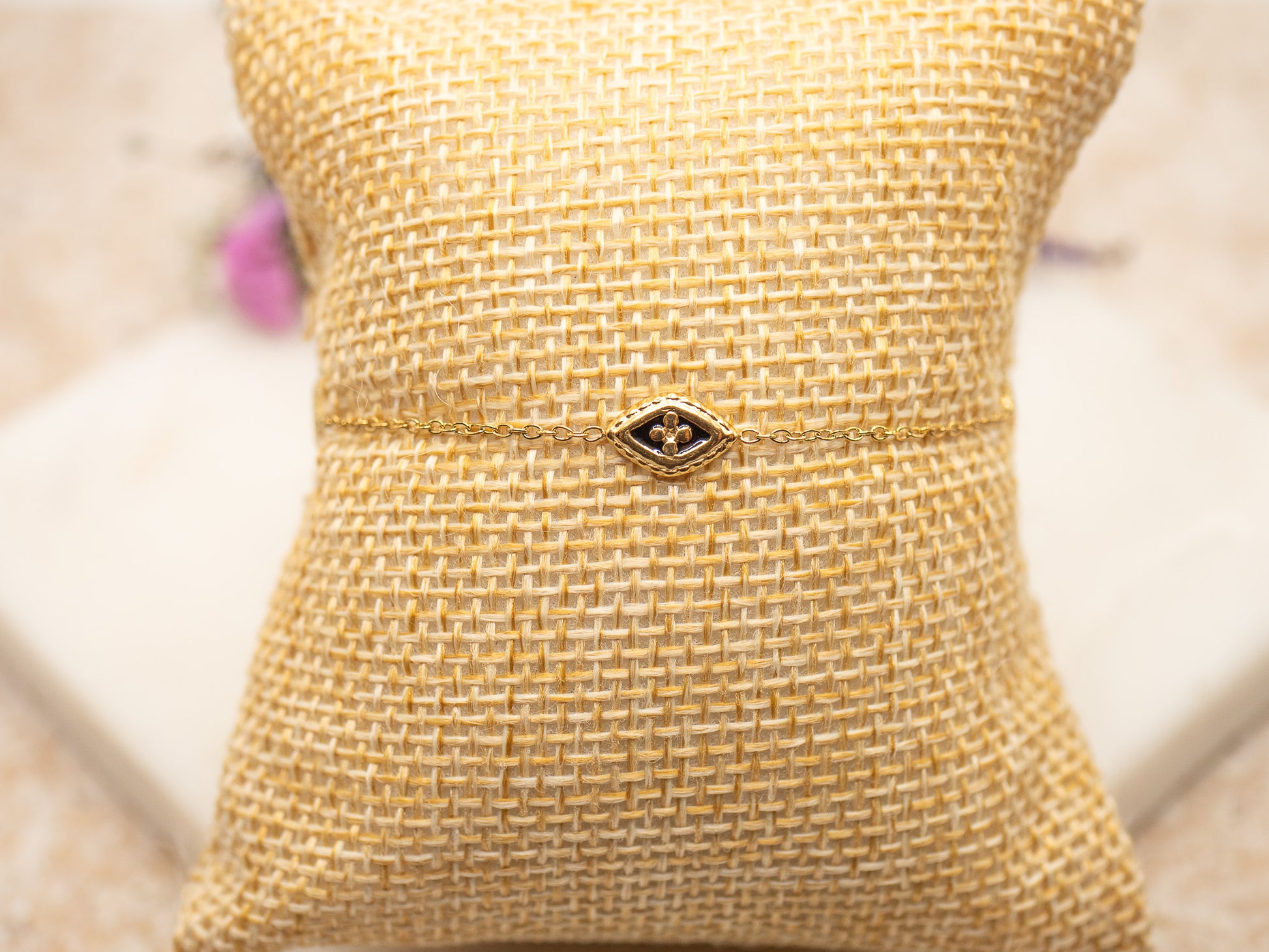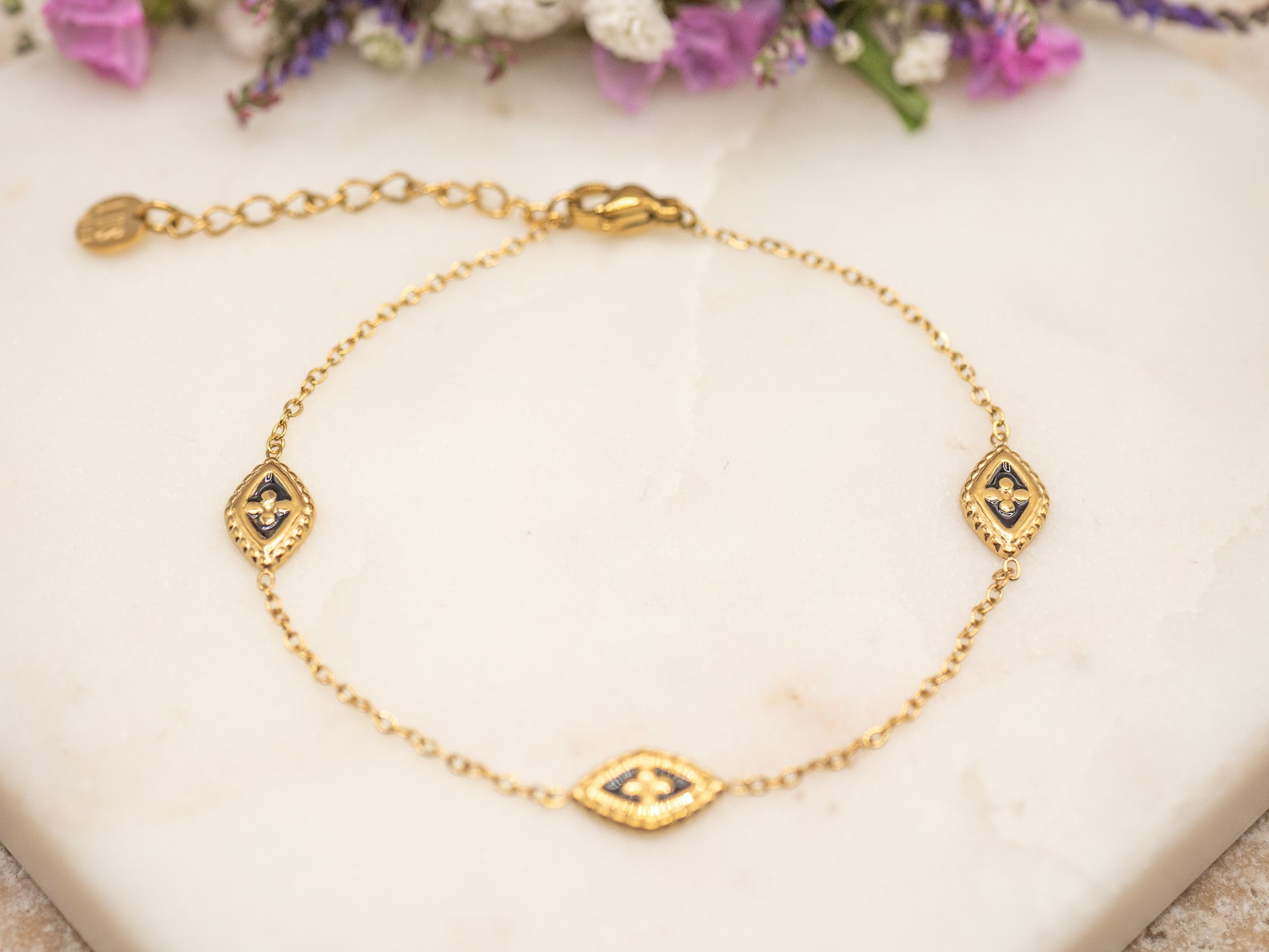 Il est composé de trois motifs œil stylisés, finement ciselés (environ 0,8 cm x 0,5 cm chacun), sertis en leur centre de cristaux noirs, contrastés par des détails dorés lumineux, pour un effet hypnotique tout en subtilité. La chaîne, légère et fluide, mesure environ 18 cm (extensible jusqu’à 21 cm grâce à sa chaînette d'ajustement).