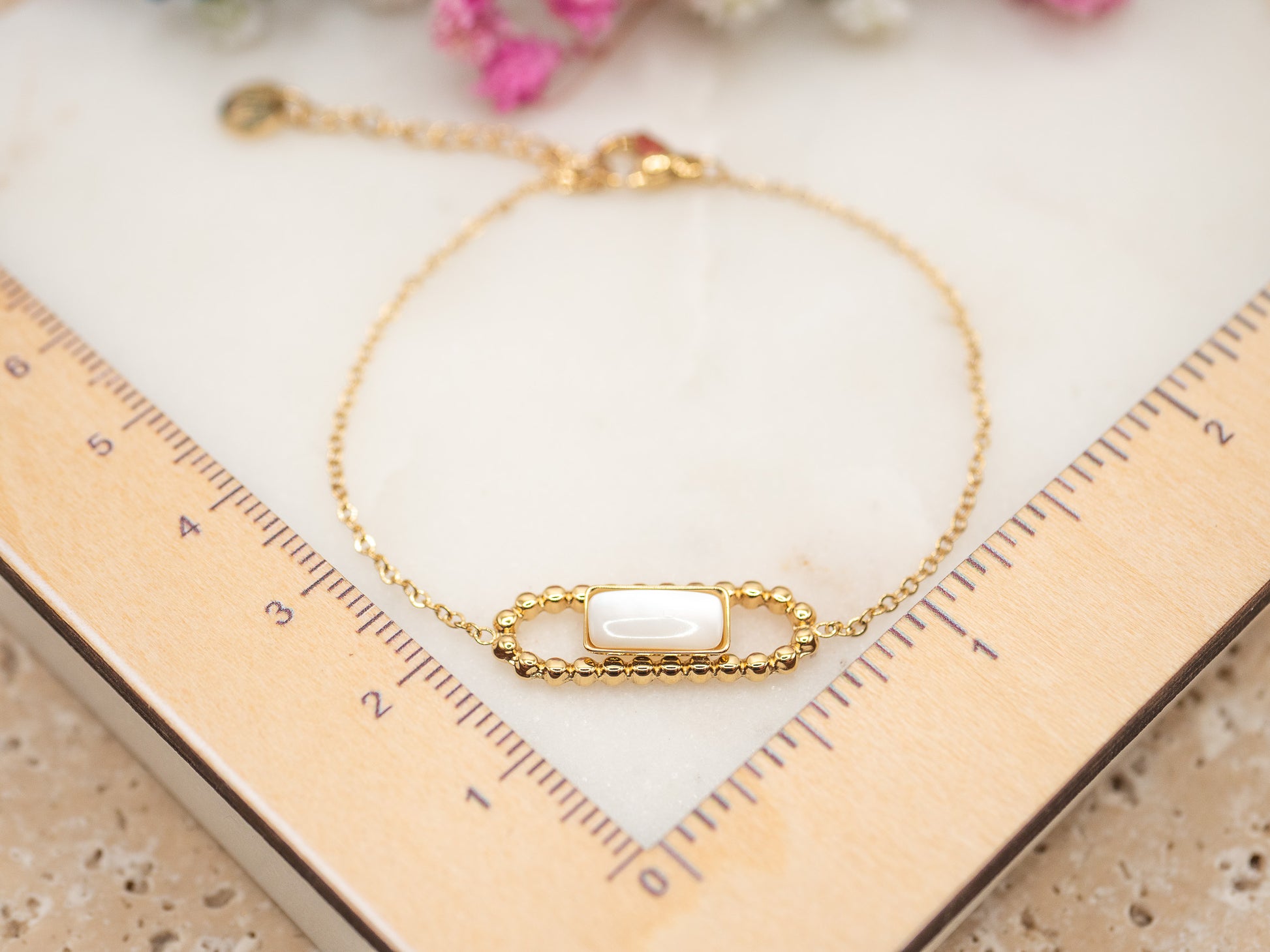 Au centre du bracelet, le cabochon rectangulaire blanc évoque les azulejos clairs et les pierres polies par le temps. Il est délicatement encadré d’une bordure de perles dorées, rappelant les motifs répétitifs des frises mauresques. La chaîne fine apporte équilibre et légèreté, comme une ligne de lumière posée sur la peau.