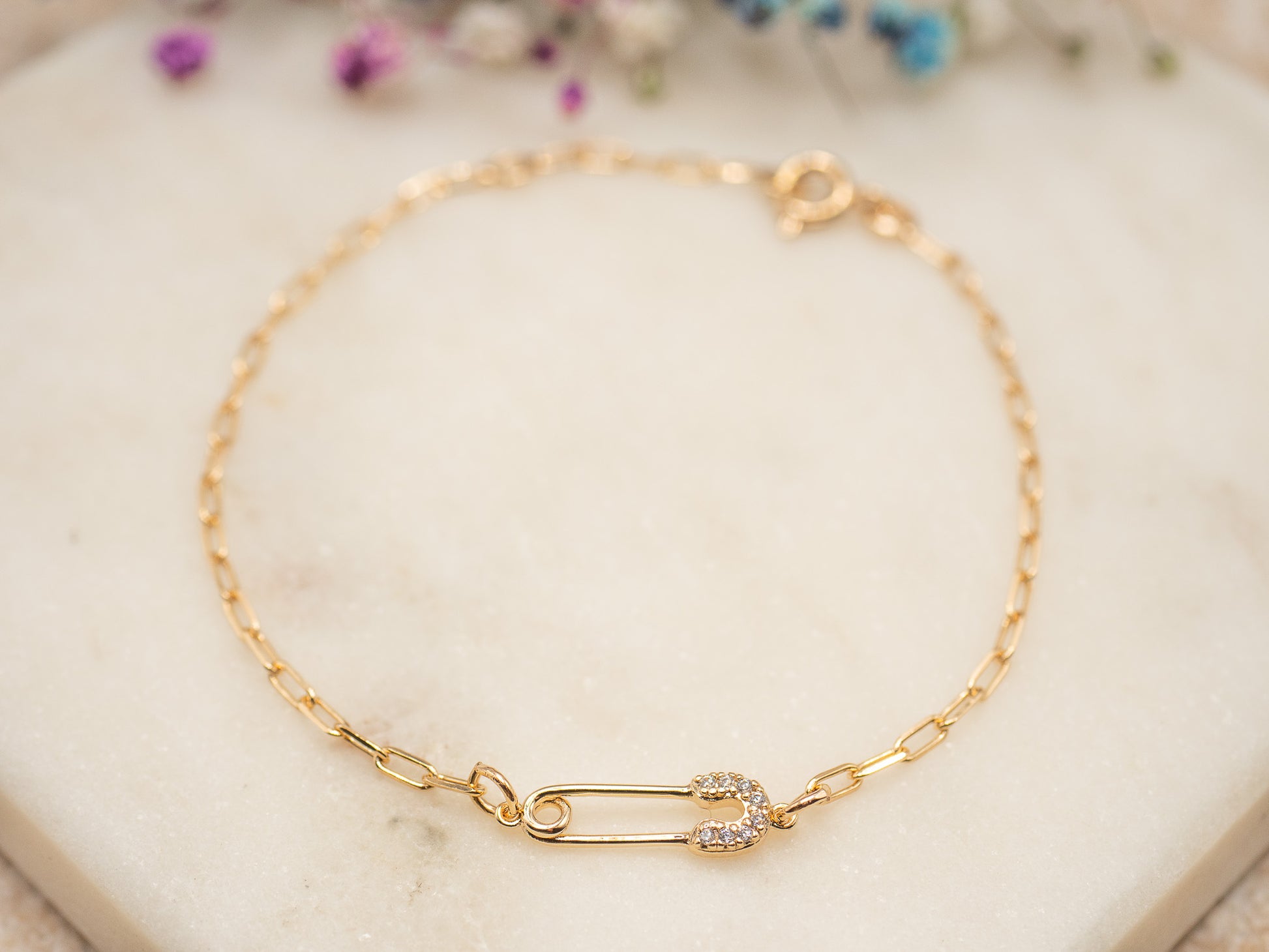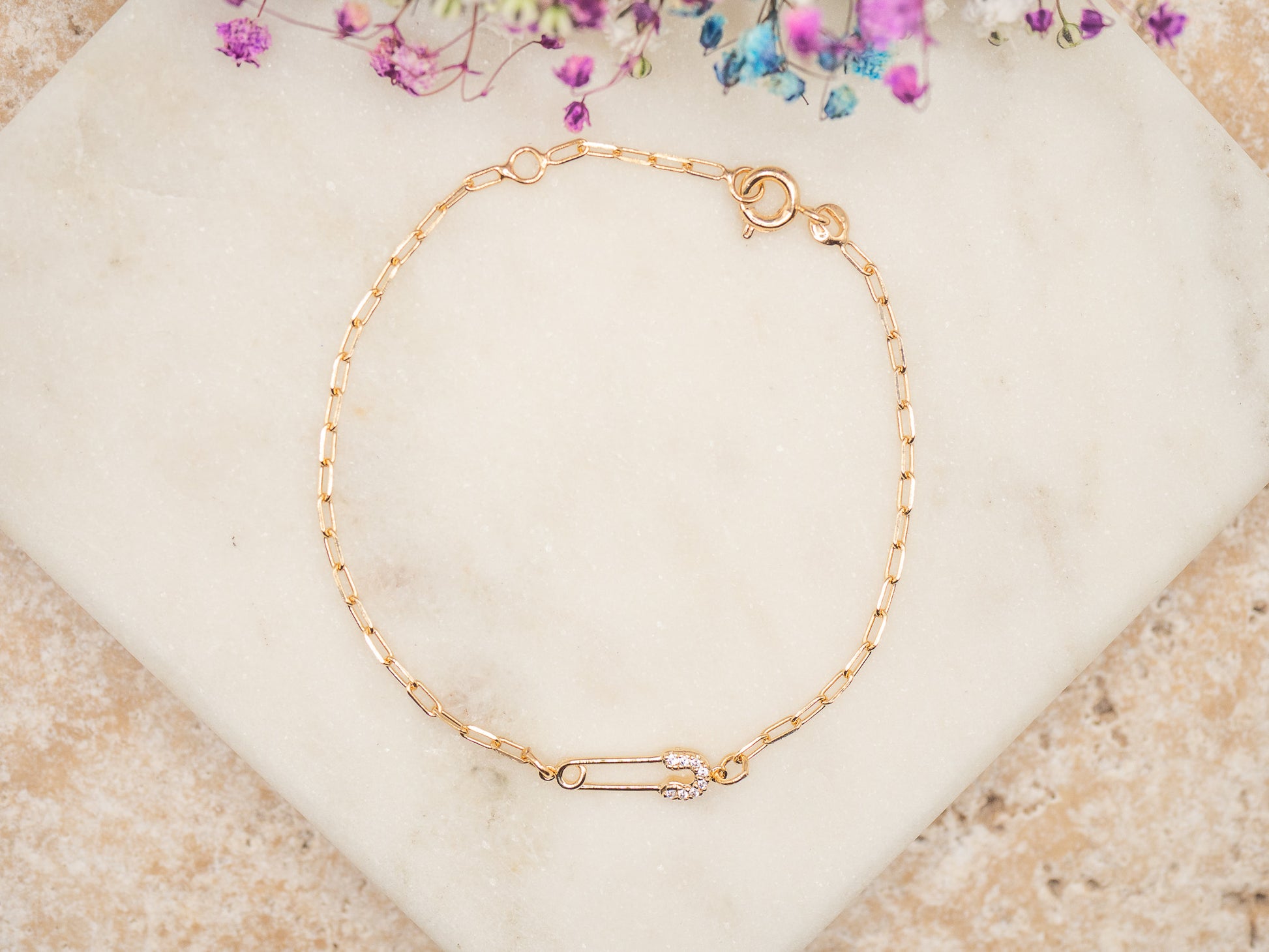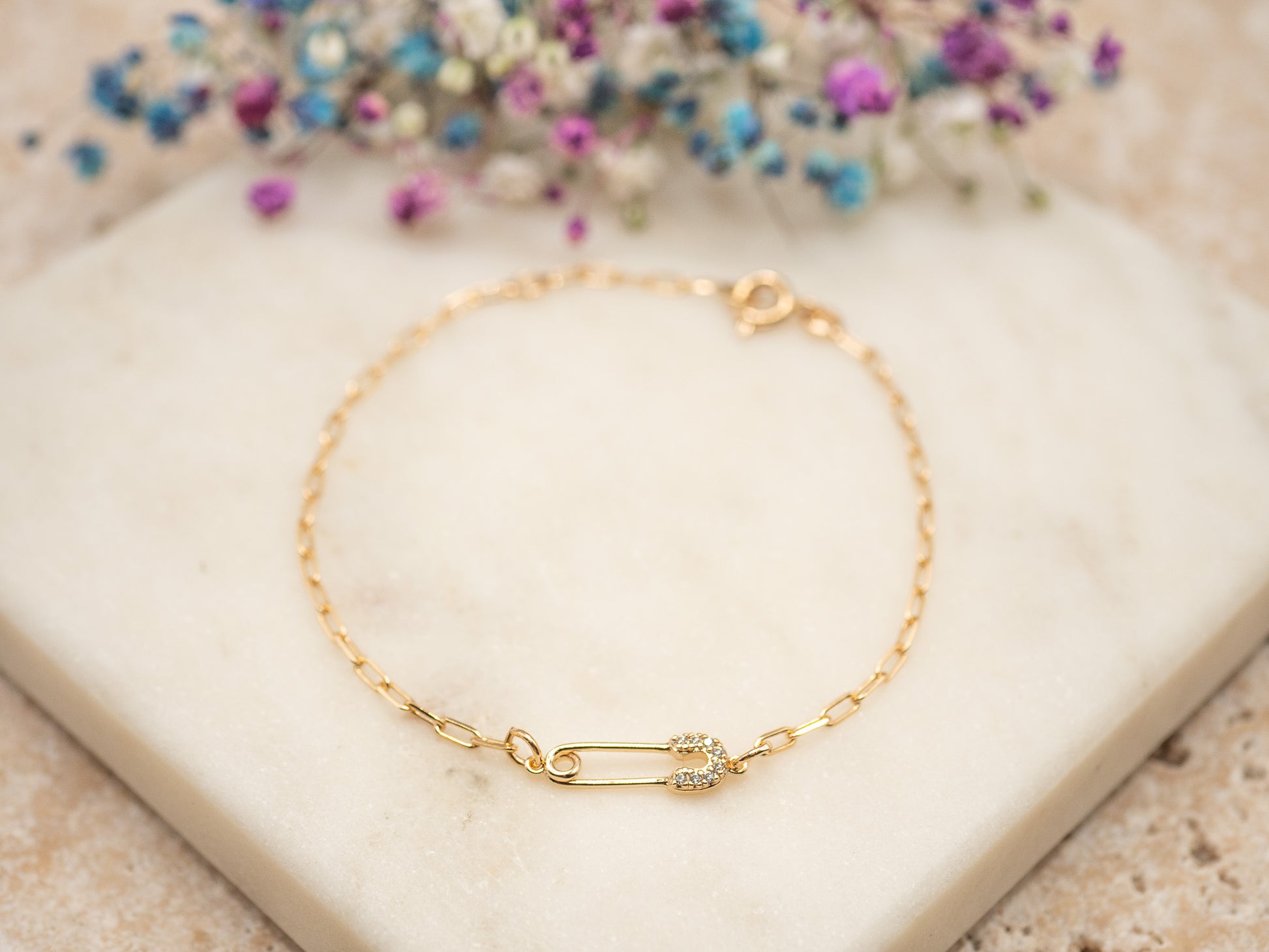 Minimaliste avec une touche d’impertinence, Britney revisite la classique épingle de sûreté en version bijou raffiné. Ce bracelet délicat joue avec les codes punk londoniens, twistés avec finesse et éclat. La maille fine plaquée or 18 carats accueille une épingle stylisée, sertie de petits zirconiums scintillants qui attrapent la lumière à chaque mouvement. Léger, original et élégant, il se porte seul pour un effet subtil ou en accumulation pour affirmer son style.