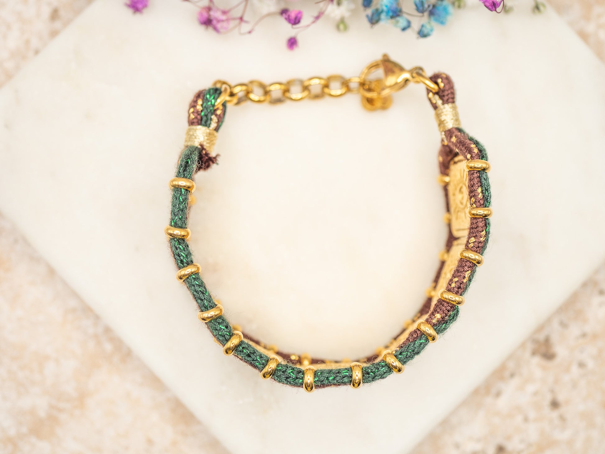 Son large bandeau souple, tressé de fils satinés vert sapin et prune, contraste joliment avec les encadrements en plaqué or 18 carats. Chaque segment est minutieusement articulé pour épouser le poignet tout en fluidité, avec ce qu’il faut de caractère pour ne pas passer inaperçu… même lors d’un dîner de famille un peu trop calme.